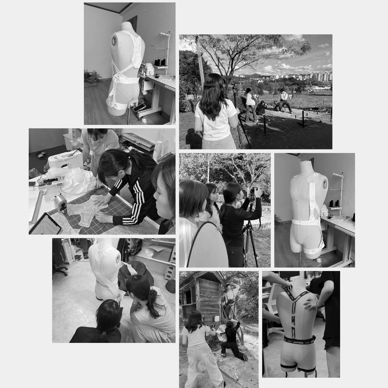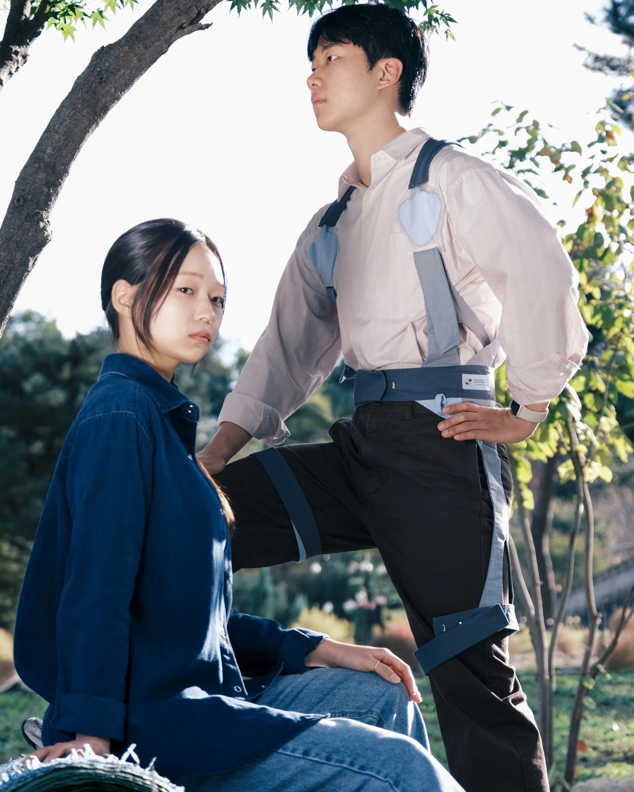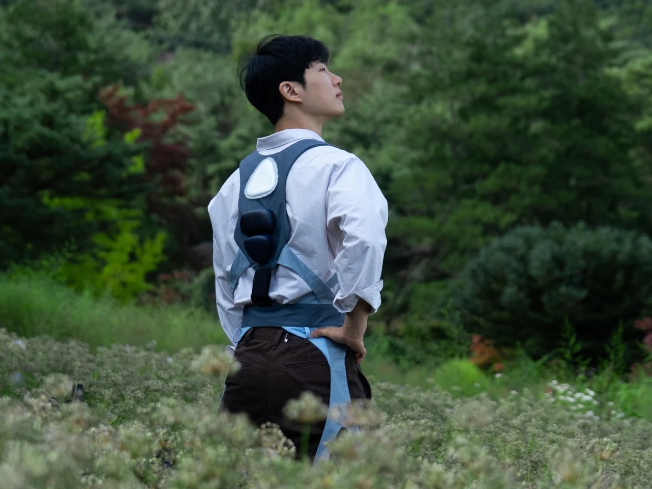 PUM是为年轻农民设计的柔软外骨骼姿势矫正背带,蓝灰色宽绑带包裹肩、躯干、大腿,配背部模块(含传感器、气泵)及工具挂点。运动传感器监测过度弯腰,超标时肩部气囊轻柔充气提醒(软体机器人触觉反馈),数据传应用追踪时长、调灵敏度,生成个性化拉伸计划助恢复。轻量如工作背心,融入田间劳作,预防背痛劳损累积,关注体力劳动者健康。
