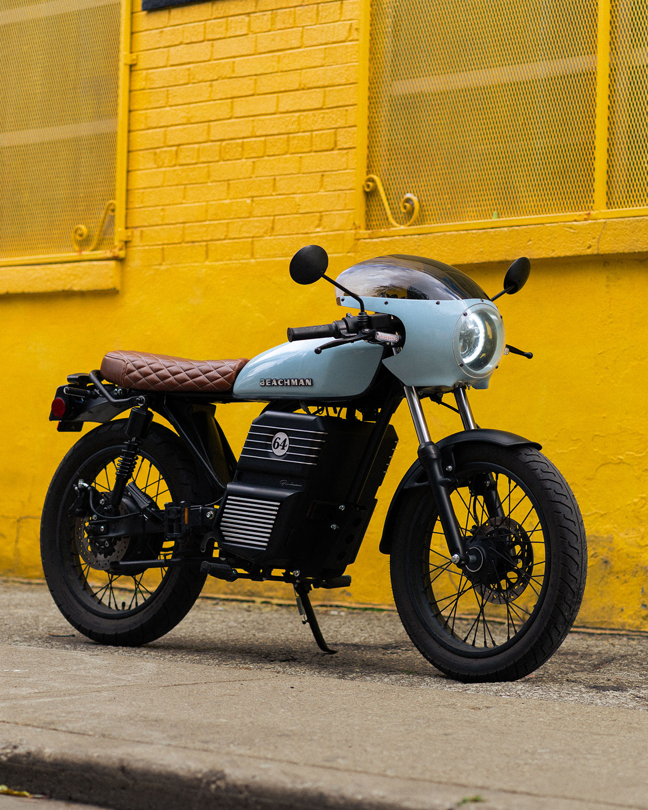 在电气化浪潮中,Beachman选择了一条少有人走的路径:以高度克制的技术介入,重塑被浪漫化的咖啡骑士摩托车文化。‘64 Street Spec Café Racer以60年代风格为原型,向后倾斜的凹面挡风玻璃、手工缝制双人座垫、街道轮胎与外露车架共同构建出纯粹而利落的复古轮廓。可拆卸锂电池系统在保证 55–70 英里续航的同时,支持能量回收制动与快速充电,满足城市与公路骑行需求。整车刻意舍弃复杂屏幕与多余交互,将注意力还给骑行本身:稳定的速度、清晰的机械结构,以及不被打扰的驾驶体验。Street Spec在克制与性能之间取得平衡,以电动形式延续咖啡骑士的精神内核。