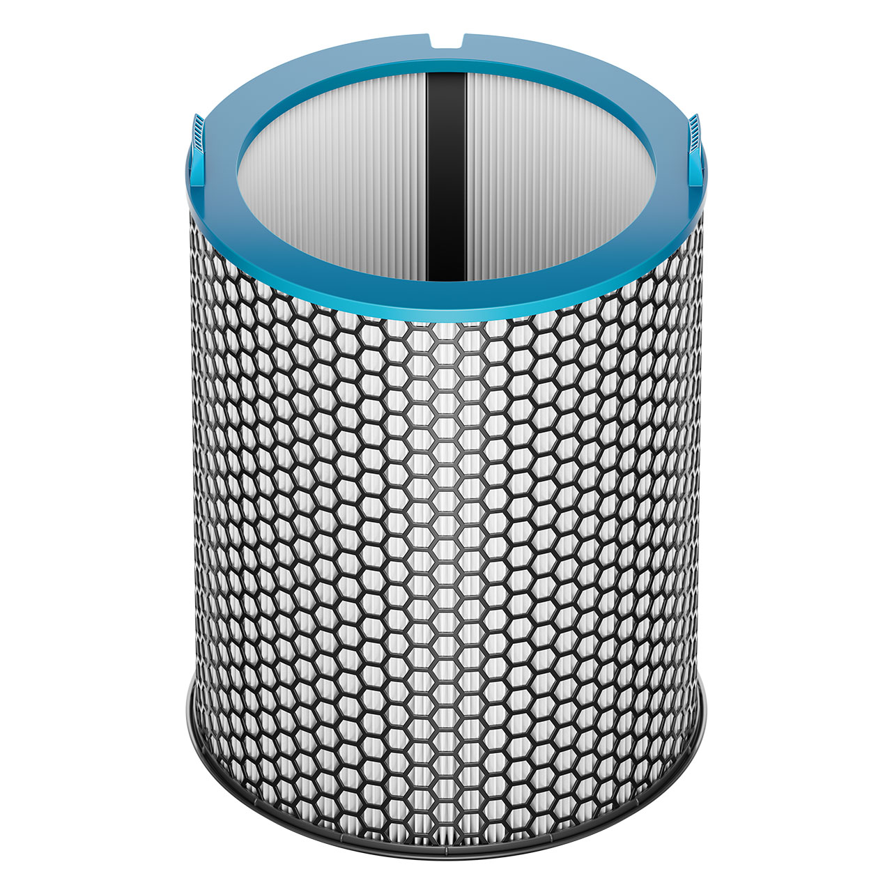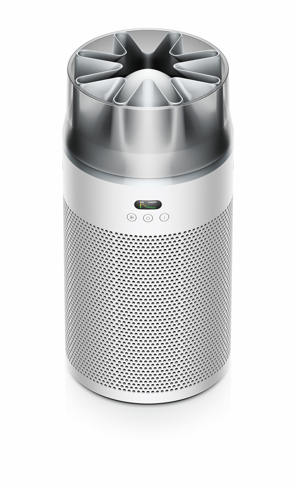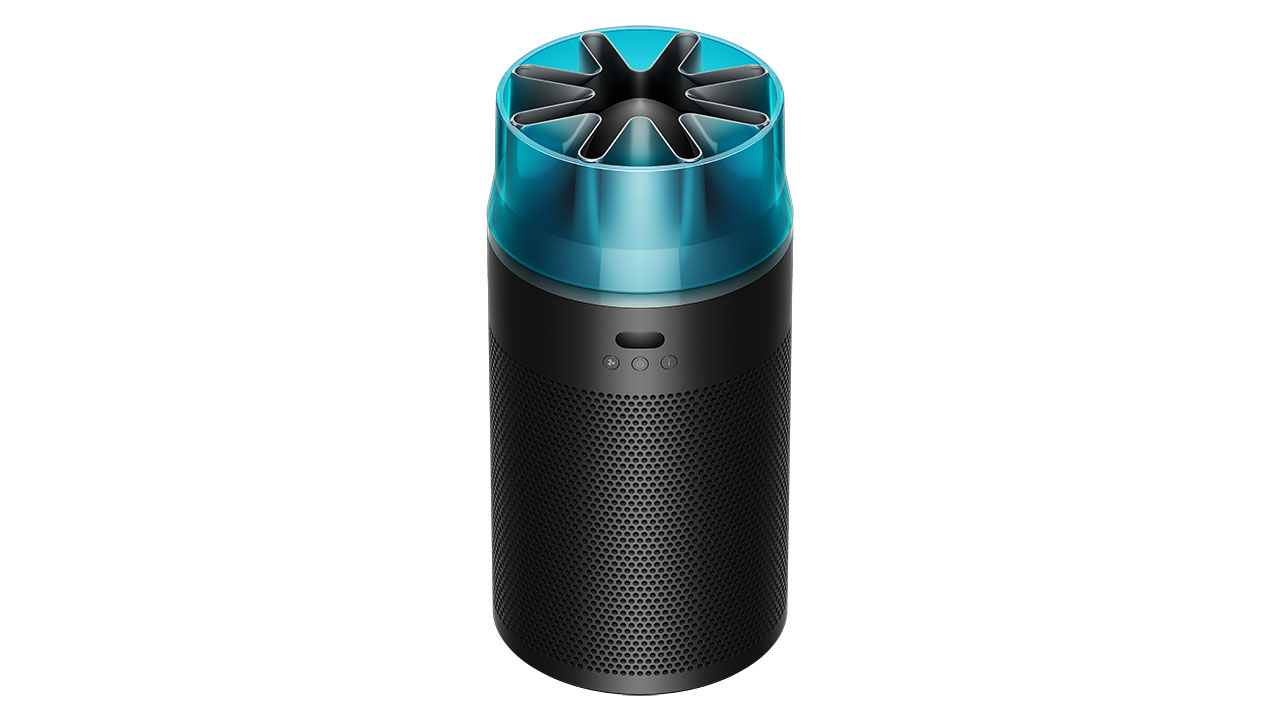 Dyson HushJet是一款面向小户型空间的锥形迷你空气净化器,通过将风道系统与星形喷嘴结构整合进机身内部,实现高风量与低噪音的并存。其集风嘴原理类似吹风机风嘴,用于平滑高速气流、减少湍流,从而降低空气动力噪声。设备在睡眠模式下噪音约24dB,可过滤99.97%直径0.3微米以上颗粒物,CADR约250 m³/h,适用于约21㎡房间。静电滤网寿命约5年,明显长于常规产品。外观采用浅灰或黑蓝配色,造型更接近小型建筑构件而非传统家电,减少对室内视觉秩序的干扰,并适应隐藏式摆放需求。