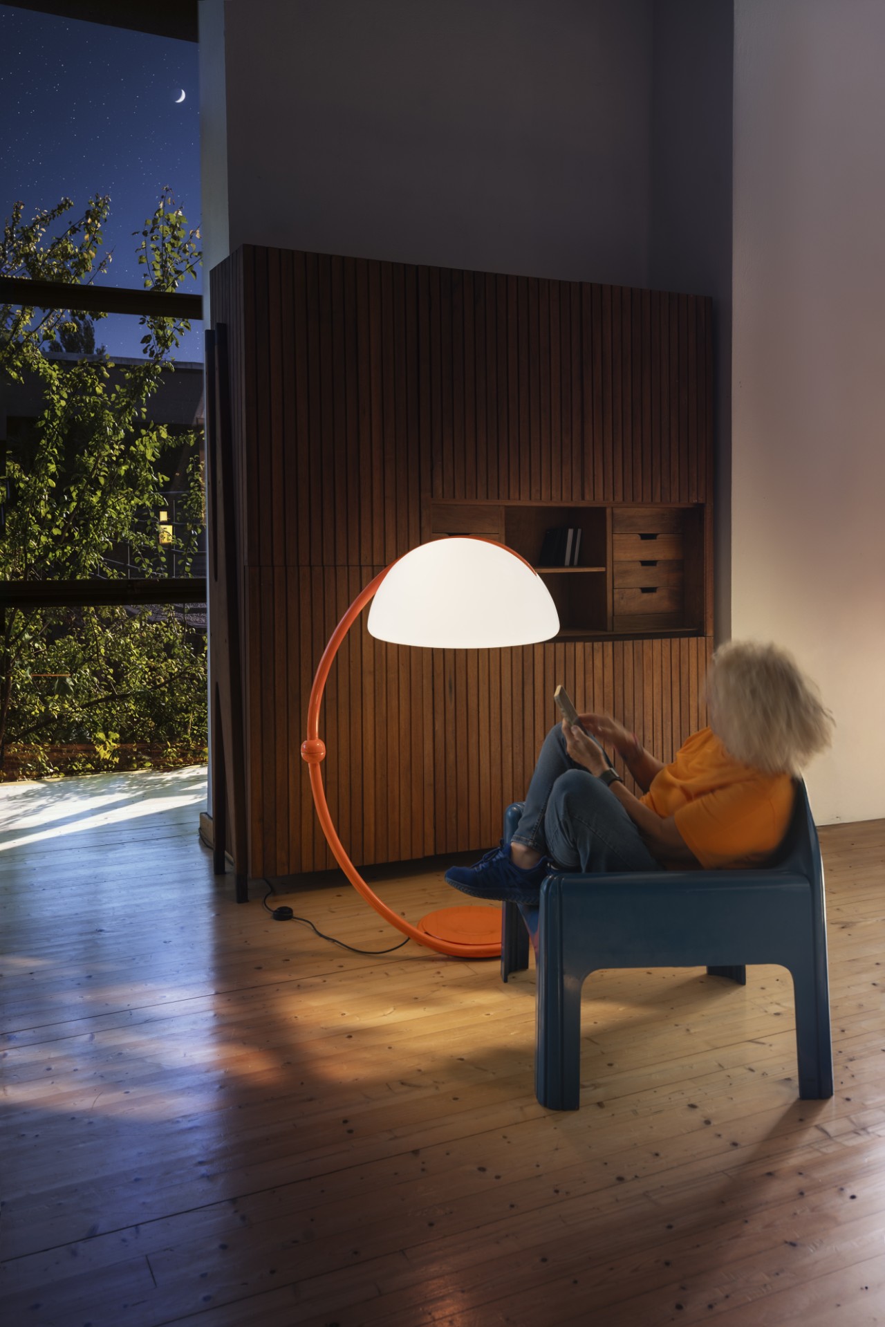 20世纪50年代,埃利奥·马蒂内利继承父亲的电器商店,并将其转型为后来的Martinelli Luce,将个人的实验精神注入灯具设计之中。1965年诞生的Serpente灯具,以蛇形般流畅的造型和旋转灯臂结构成为品牌代表作。其漫射器可360度旋转,光线随姿态自由流动,兼具实用性与强烈的动态表现力。Serpente采用当时前沿的热成型工艺,实现复杂曲面与底切结构,是形式、功能与制造实验的高度统一。60年后,Serpente以纪念版橙色回归,这一充满能量的色彩既呼应波普艺术时期的乐观精神,也象征着品牌始终延续的创造力与生命力。