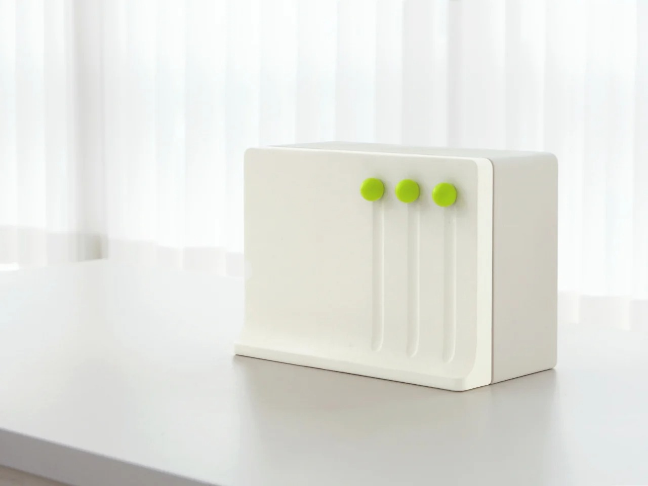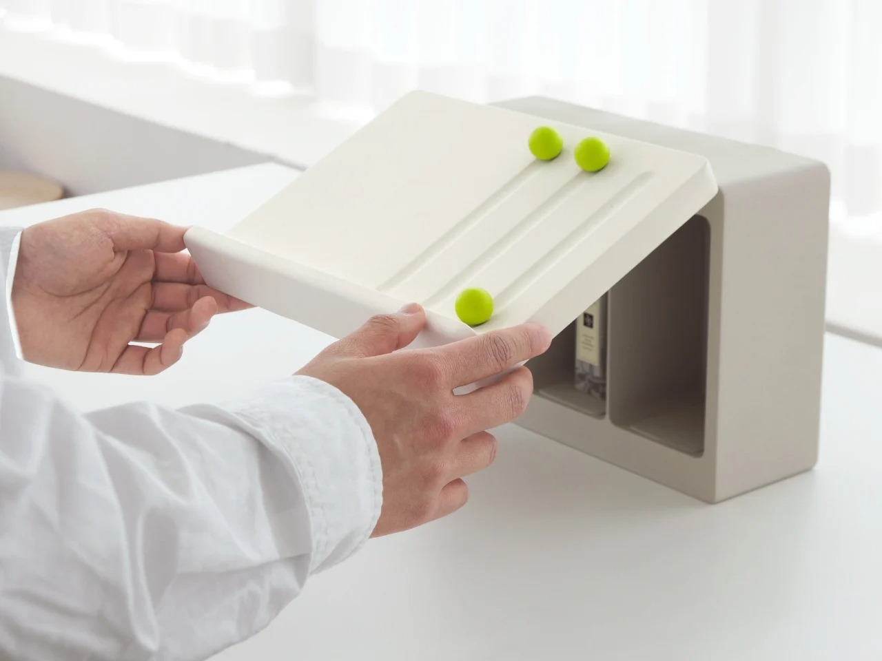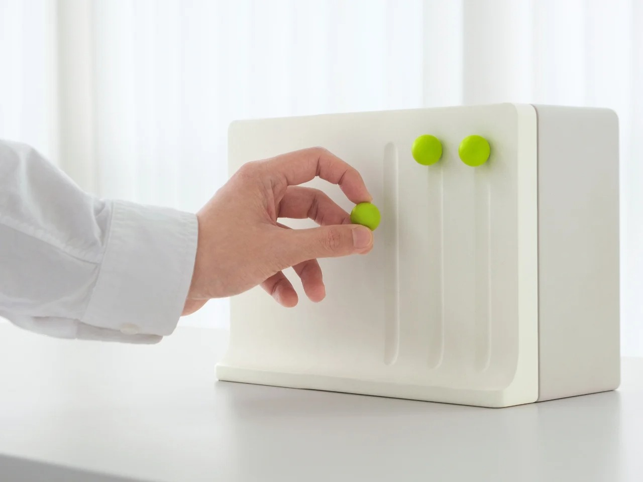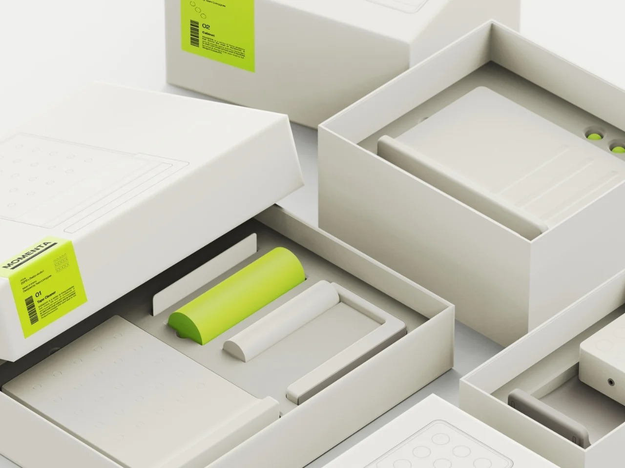 Momenta是一套运用行为心理学设计的家居用品概念,旨在通过“缺陷触发器”引导用户自然而然地开启家务。系列包含三件产品:胶带清洁器通过磁性面板上随机弹出的触发器,提醒你清洁;储物柜在物品未归位时,会有一个小球落入空位,暗示缺失;洗涤剂分配器则通过一个变色的拨杆,在你冲洗它时自动分配洗涤剂,顺势启动洗碗流程。整个系列设计简洁低调,无电子提示,旨在顺应本能,用微小的物理线索化解“开始行动”的阻力。