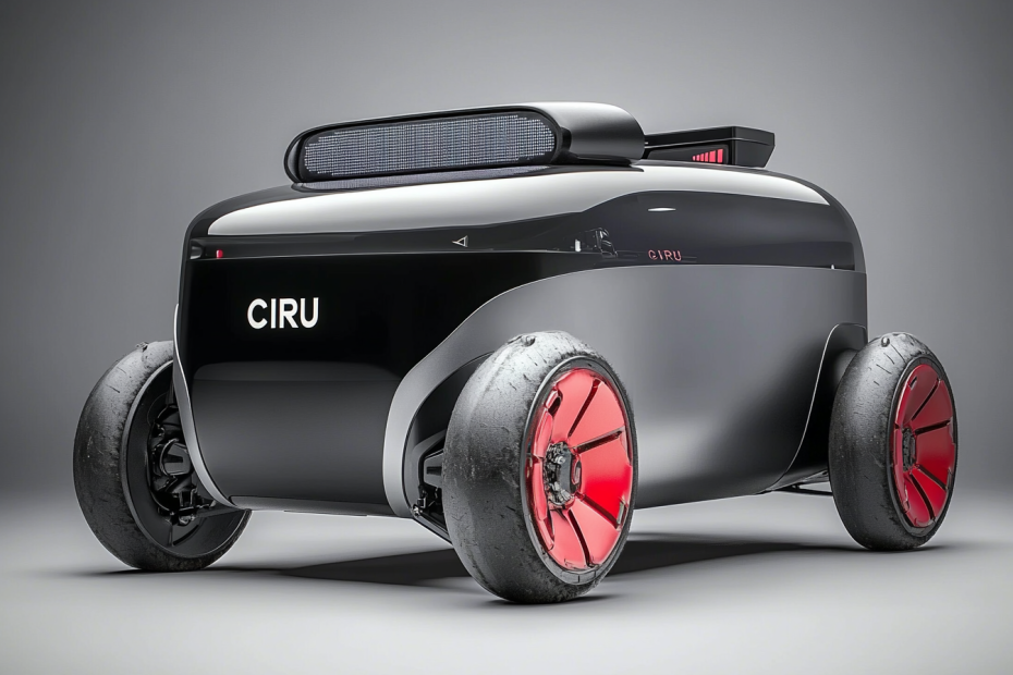 https://s.mj.run/OCE195YcwFE A futuristic robot delivery car with four wheels and red tires, designed in the style of Apple for the future of electric vehicles. The sleek design features a large screen on top, giving it a high-tech look. The product photography showcases the car in a studio setting with lighting, resulting in a high-resolution, detailed texture, and high-contrast image against a gray background. The name "CIRU" is written in white letters on the front panel. --ar 128:85 - Image #2 @MicMJ