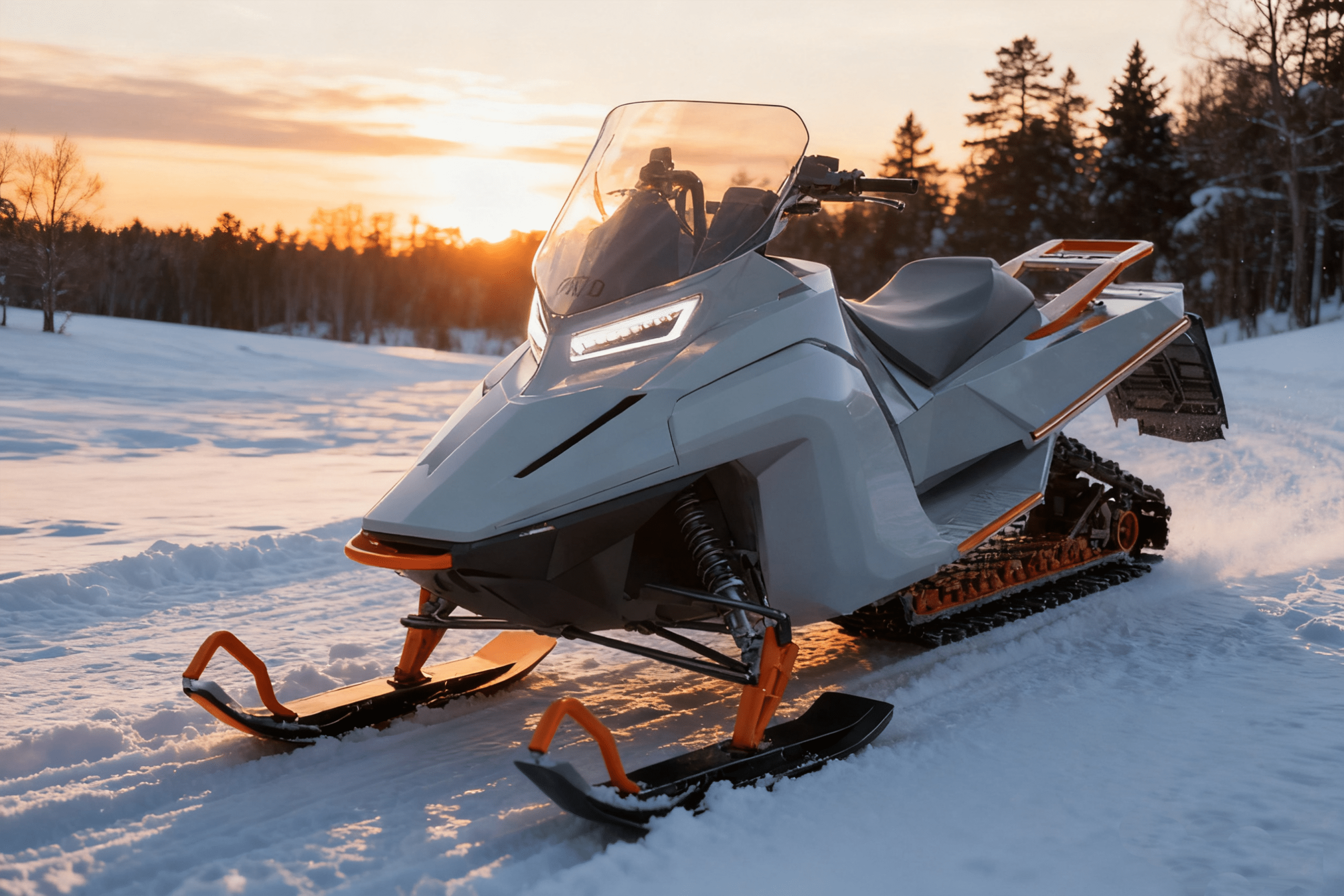 https://s.mj.run/O7atN-DzpgY snowmobile design, concept car, electric vehicle body shape like the tigo e-bike frame, high-end materials and textures, light grey matte paint material with black plastic parts, orange accents on snow plow and wheels, studio lighting, product rendering effect, global illumination, high resolution. the overall appearance of the machine is simple but futuristic, showcasing an elegant yet powerful style that makes it stand out in snowy landscapes. it has two precision led headlights and a large windscreen for eyecatching design --ar 128:85 --v 7.0 - Image #4 @MicMJ