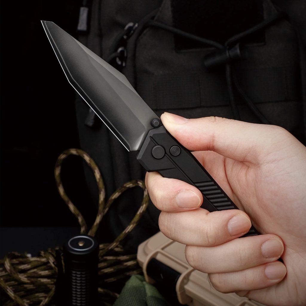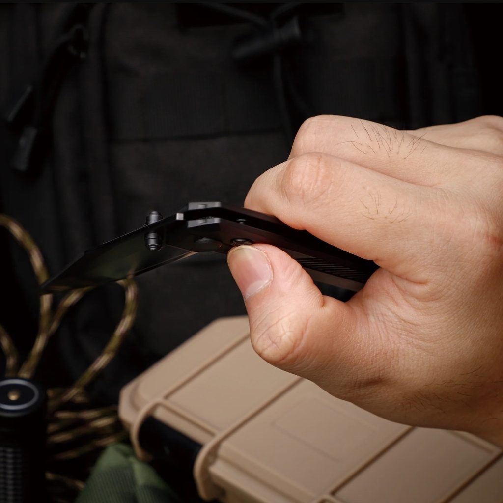 这款折叠刀采用航天级 5 号钛合金手柄,配合黑色钛涂层处理,具备卓越的强度重量比与耐腐蚀性,同时外观简洁、手感舒适。