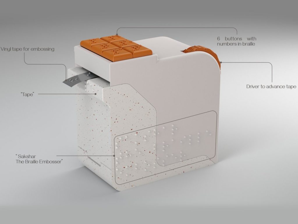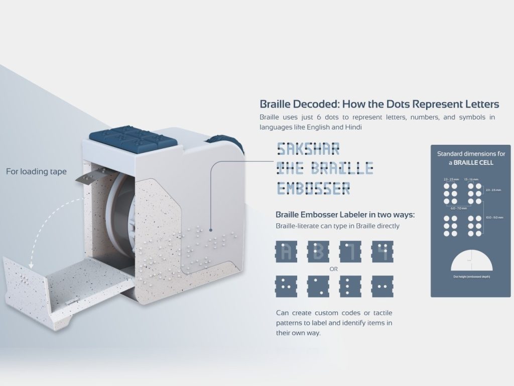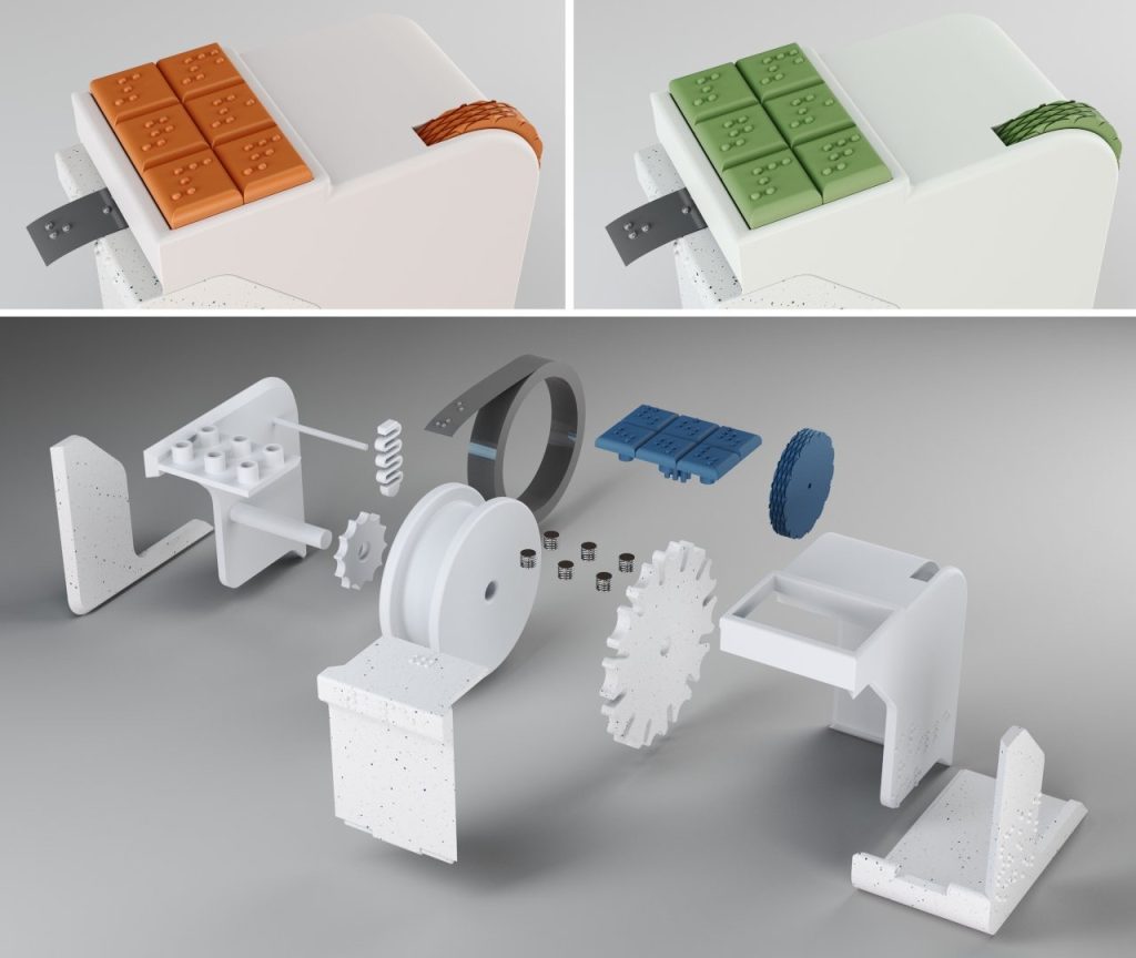 Sakshar盲文压印机由设计师Shruti Kushwaha创作,以“让触觉标记独立于电力”为理念。采用全机械日内瓦结构,通过按压式盲文按钮与自进式乙烯基胶带配合,实现无需电源的即时标签打印。防水耐用机身搭配多色设计,使视障用户能在厨房、药瓶等场景快速创建持久黏附的盲文标识。