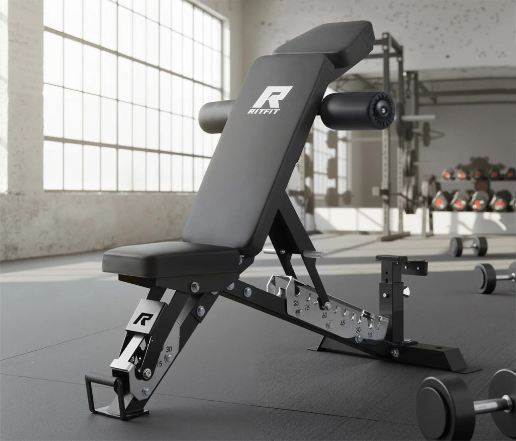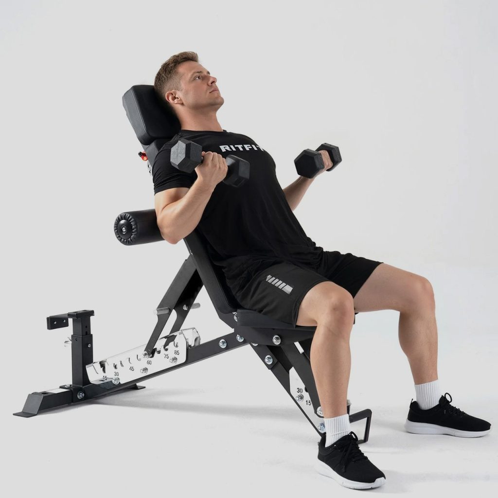 RITFIT GATOR三段式训练凳,21种角度组合(靠背/头枕/座椅/下斜),适配各类训练。加厚钢管承重1600磅,头枕单独承396磅,稳固安全。70mm泡沫+乙烯基皮坐垫舒适,封闭调节防夹。可竖立收纳省空间,哑光黑融家居。从新手到专业运动员,陪练成长,是高效家庭健身房理想之选。