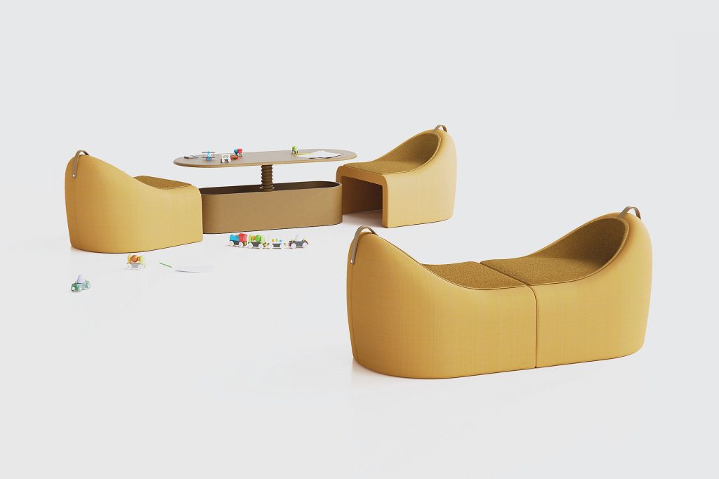 Twiny是一款面向家庭与早教环境的多功能模块化沙发,集趣味性、可持续性与儿童安全于一体。表面看似一款色彩丰富的沙发,但通过分开两块沙发单元,可隐藏调节高度的桌面与储物空间,支持玩耍、学习、休息等多种活动。沙发内部采用100%再生聚酯纤维,桌面由回收木材与塑料复合材料制成,环保且安全。孩子可以轻松操作分离沙发单元,使用隐藏空间,同时培养整理能力与创造力。Twiny针对小户型与多变空间设计,为儿童成长提供可持续、灵活、有趣的解决方案。