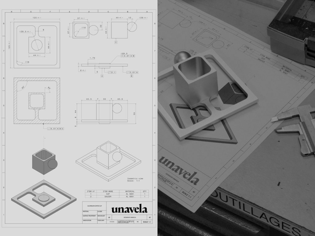Aluminum coffee cup是UNAVELA首款功能性物品,立方体浓缩咖啡杯由整块6061铝材CNC加工,配球形把手与镂空方形碟,喷砂阳极氧化呈哑光银。50ml容量,内壁反射咖啡暖色调不影响口感,拿握不烫手、饮用顺滑自然。几何造型如雕塑,手工组装检验,保养似意式咖啡机(水洗禁皂洗),重仪式美感而非保温,让喝浓缩成与材质互动的体验。