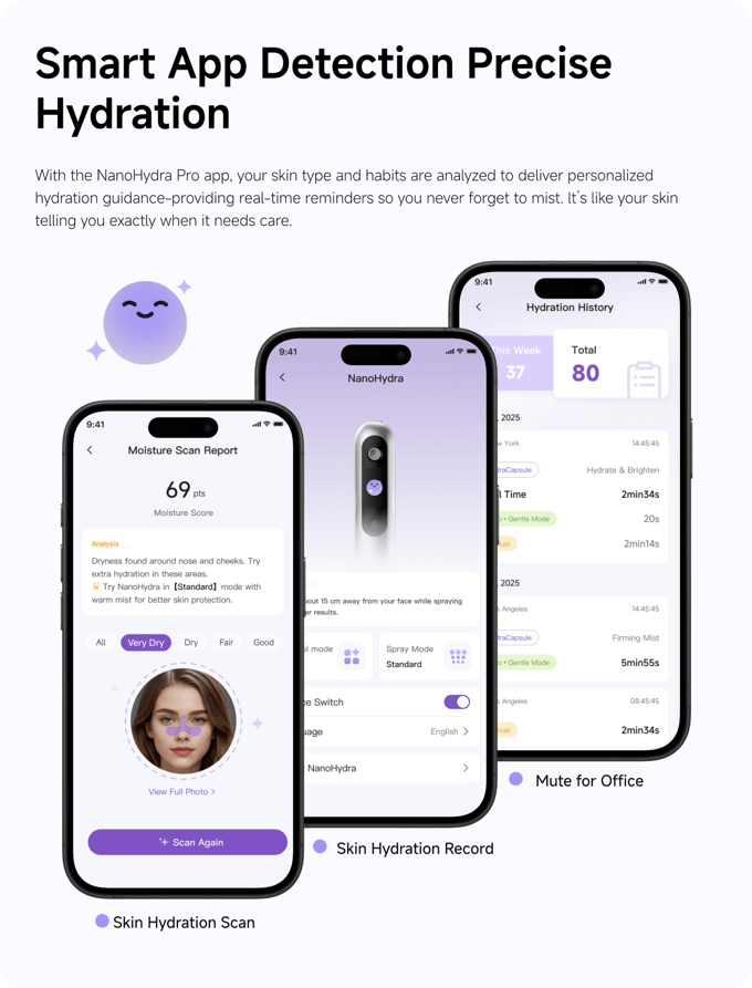 NanoHydra Pro以“让补水真正便携”为核心,将专业雾化技术、智能传感与个性化护理整合入掌心大小的设备中。其10微米超细微雾可将爽肤水与精华液雾化成高渗透云雾,较传统方式提升约2.6倍保湿效率,并减少涂抹浪费。机身搭载ToF距离传感器,可依据与面部的距离自动调节雾量与覆盖范围,并在超出使用距离时自动关闭,确保精准、节省与安全。配套App可调整雾化设置、跟踪保湿效果、生成个性化建议,使护肤过程更具数据化与可控性。内置五种智能模式,适用于办公室、户外、旅途与日常护理等不同场景;胶囊舱结构可牢固封装液体,防止渗漏;电池续航可维持一周使用,为移动补水提供可靠保障。NanoHydra Pro旨在重构随身补水方式,使护肤更轻盈、更即时,也更贴合用户的真实生活节奏。