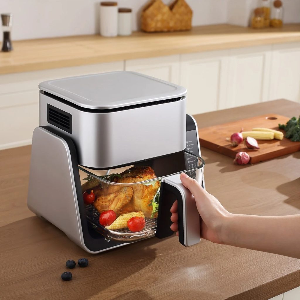Aouball空气炸锅可180°翻转变身电磁炉,一机多用。主机装旋转底座,向下翻转为烤箱/空气炸锅(带风扇+透明玻璃篮助气流),向上翻转锁定为灶台(配3英寸深不粘托盘、玻璃盖、把手),支持空气炸、烘烤、煎炒、蒸煮等。节省厨房空间,适合小户型/宿舍,获A'设计大奖。中国可购,批发价约36美元,性价比高,解锁多功能烹饪新体验。