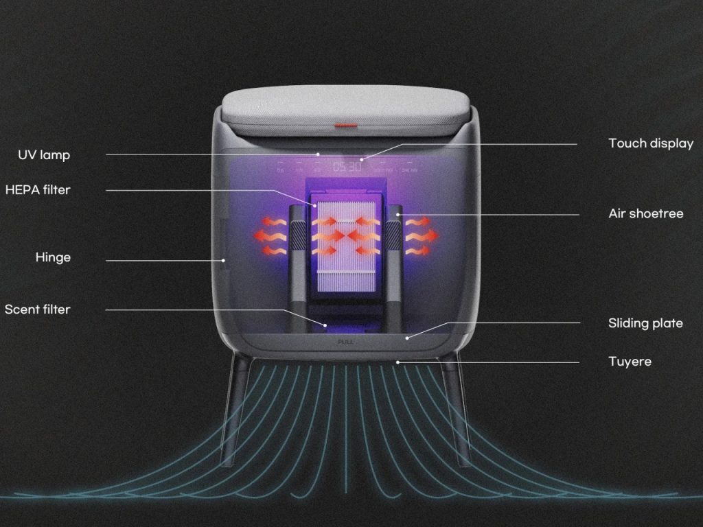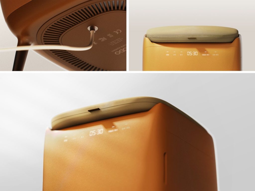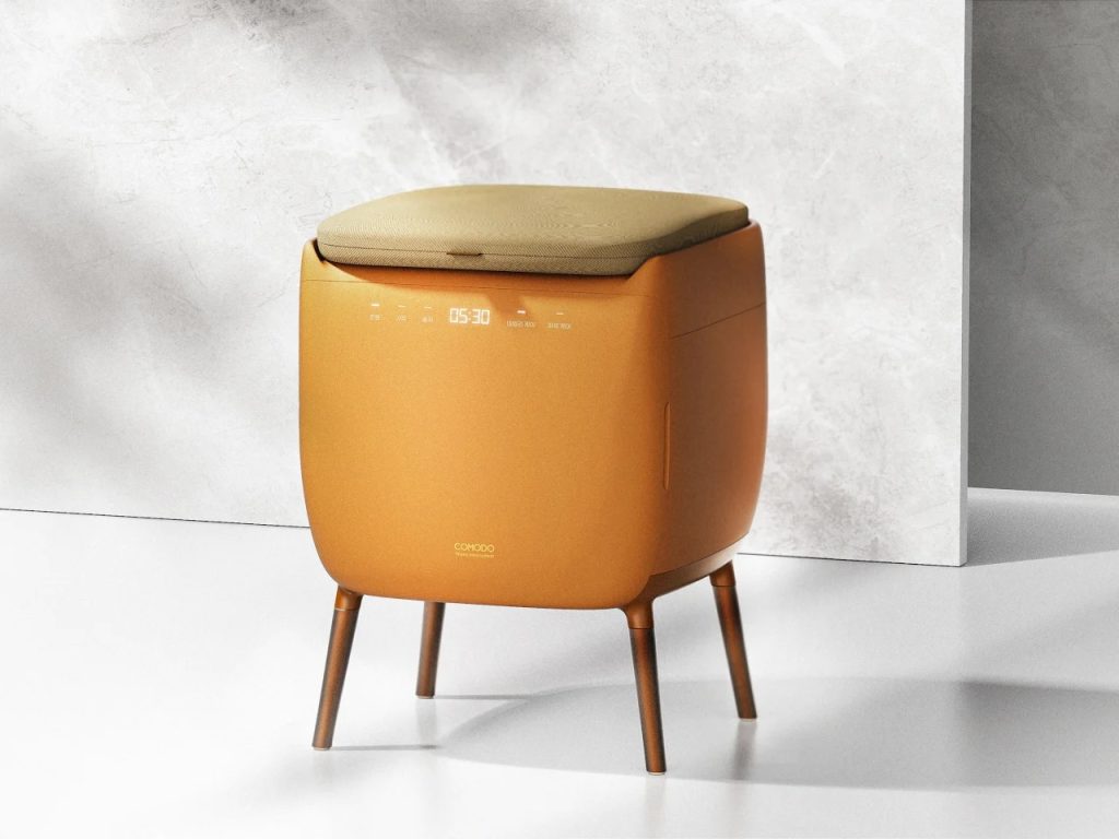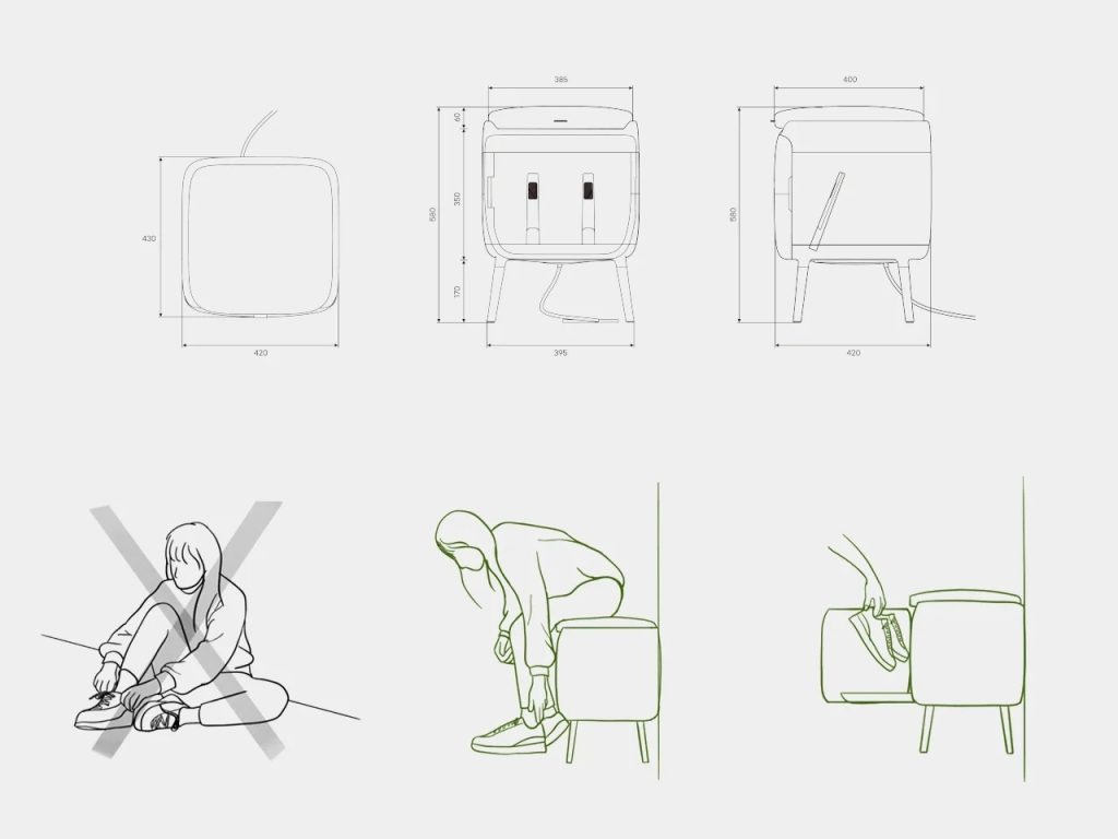 COMODO玄关凳解决鞋子潮湿异味困扰,设计理念源于西班牙语“舒适”,将鞋履护理融入进门流程。柔和圆润立方体造型,细支腿支撑,炭灰/芥末黄/鼠尾草绿多色调,哑光纹理+软垫坐垫,似家具非电器。内置空气鞋架、通风口,温暖空气循环烘干;HEPA+香氛过滤器除味增香,紫外线灯杀菌;气垫鞋撑适配运动鞋到踝靴,滑动底板方便穿鞋。兼作舒适坐凳,软垫顶部高度适中,坐享穿鞋不弯腰,让鞋履收纳变呵护,日常角落添用心设计。