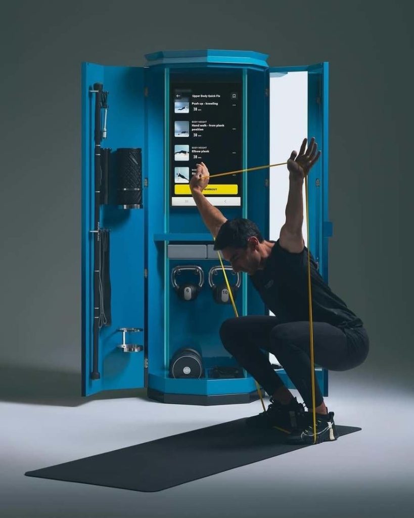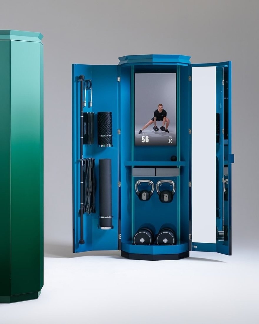 Ottagono是由建筑师Giulia Foscari为Cassina Custom Interiors设计的多功能健身家具。其核心理念是“将完整健身房优雅隐藏于居家空间”。产品外观为高大的八角形立柱,采用由上至下的渐变色调,闭合时宛如一盏雕塑感落地灯。内部则集成了全套Technogym健身器材,包括哑铃、壶铃、阻力带、屏幕与镜子,可在不足一平方米的占地面积内,实现从氛围灯具到私密健身房的瞬间切换。