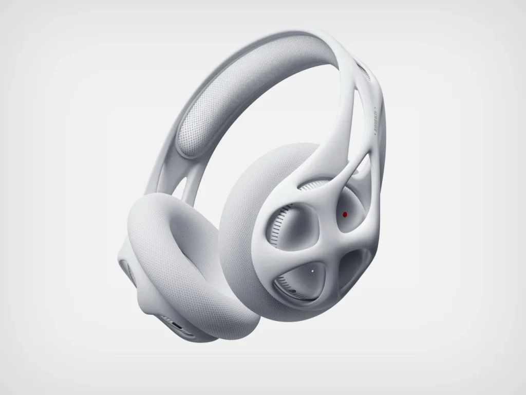 通过生成式设计,软件模拟数千次结构迭代,在满足强度与轻量的前提下,自然形成如珊瑚、骨骼般的镂空骨架——每处孔洞与曲面都由力学逻辑决定,而非美学偏好。外观看似原始甚至外星,却搭配金属外壳与钻石编织耳罩,粗粝与精密并存。白灰色调强化“风化骨骸”质感,深色版本则更显未来感。它不迎合消费电子惯用的圆滑语言,而是把工程逻辑直接外显为设计语言。Grow 提出一个大胆可能:好设计不必被“人眼审美”驯化,也可以由算法自然演化。