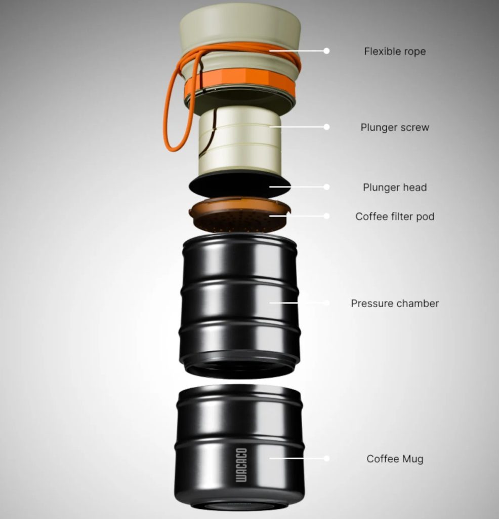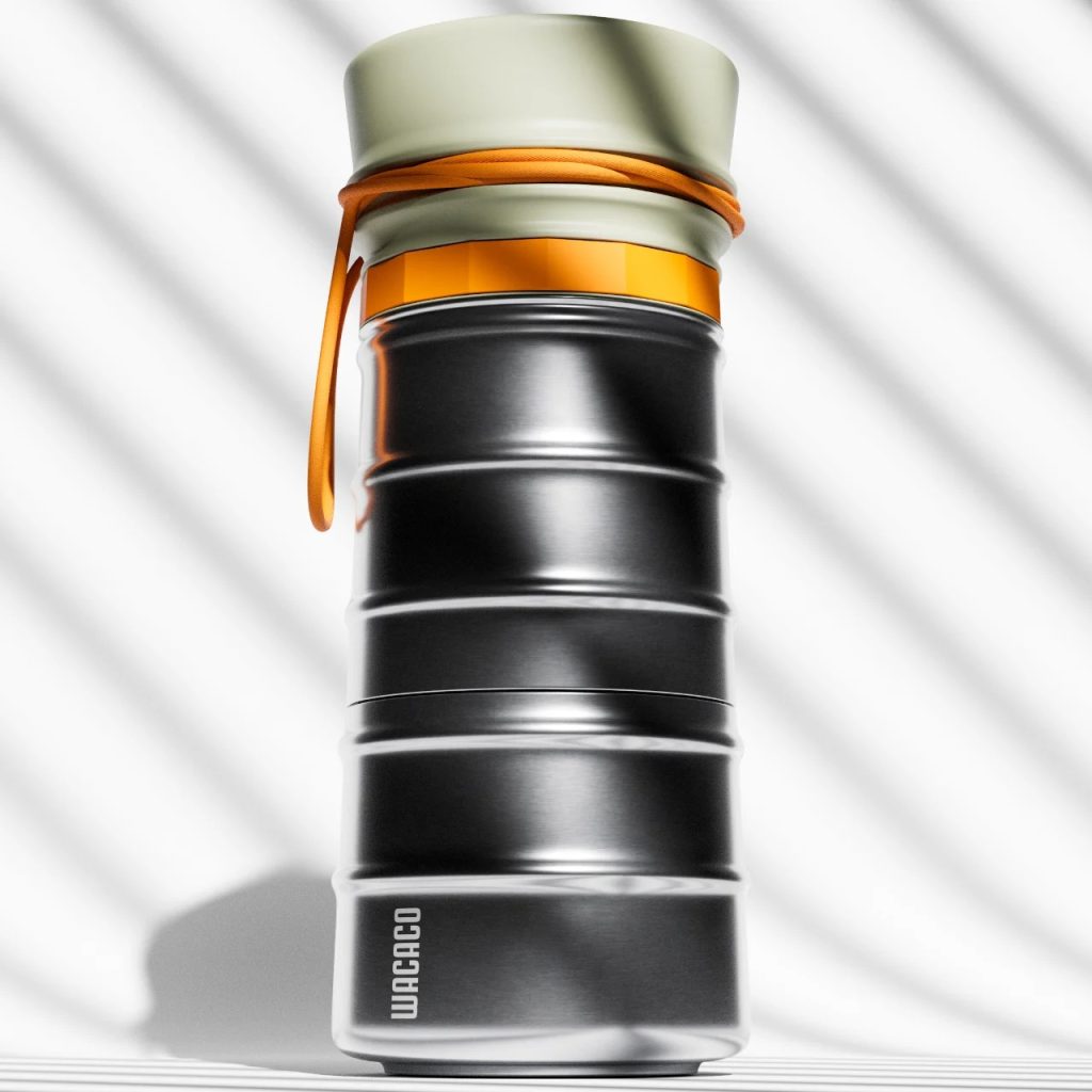 MokaMax是一款由设计师Somya Chowdhary打造的便携式压力咖啡机,其核心理念是“将完整的意式浓缩制作系统压缩至一个旅行杯中”。产品采用食品级不锈钢材质,外观为带防滑纹路的圆柱体,兼具旅行杯的便携性与咖啡机的功能。内部集成压力室、滤芯与活塞,通过旋转即可产生压力萃取咖啡,所有部件可倒置收纳,大幅简化了在户外或旅途中制作和携带咖啡的流程。