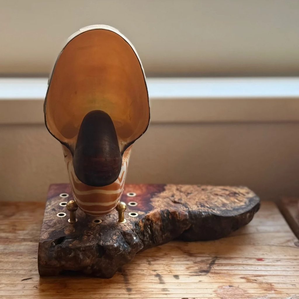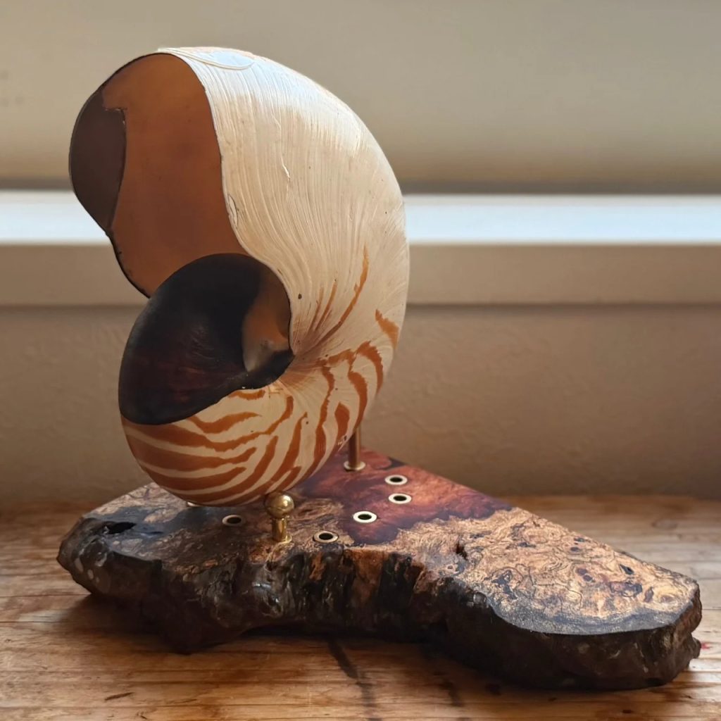 破鹦鹉螺壳改的扬声器,握手里能摸着听歌,声音中带有浓浓的复古味。