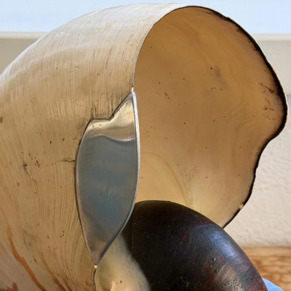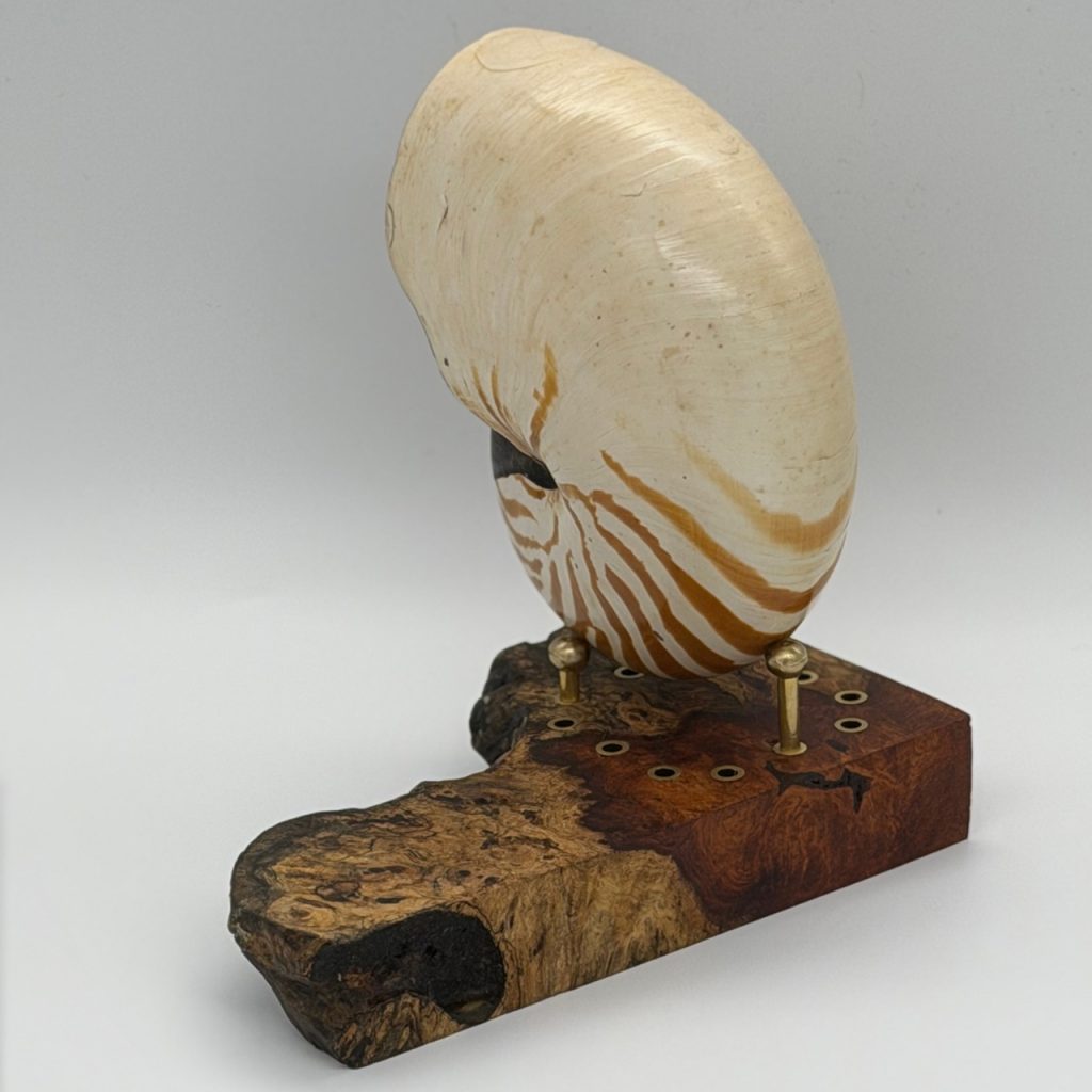 Steampunk Nautilus是hide-key(隐藏钥匙)DIY的鹦鹉螺壳触觉扬声器,灵感源于Sazae Radio抽签失败后自制。用5亿年鹦鹉螺壳(活化石,名同凡尔纳潜艇),遵蒸汽朋克金缮修复、环保可逆、触觉驱动三原则。破损壳经铝板贴合、硅胶激励器藏腔、榅桲木底座配黄铜调节制成。可骨传导聆听、切换内外音质、双壳立体声。将失望转触感美感,邀用心感音乐,非仅听,变破损化石为可逆振动乐器。