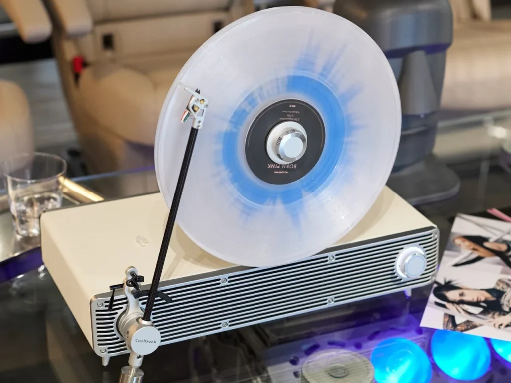黑胶不仅是声音,更是视觉艺术。CoolGeek 推出的 VS-01 垂直蓝牙唱机,将唱片从平躺的角落请上墙面舞台——垂直旋转的设计让每张黑胶都成为动态装饰。机身采用 CNC 铝合金格栅、环保皮革包裹 MDF 板与手工碳纤维唱臂,融合复古造型与现代工艺。内置 2.1 声道音响系统,含两个高音单元与 30W 中低音喇叭,配合桌面反射声学结构,无需外接音箱也能呈现饱满音场。支持 33.3/45 RPM 稳定转速、蓝牙 5.3 无线播放,还能将黑胶音频无线传至耳机。无论是深夜私享还是朋友聚会,它既是播放器,也是客厅里的声音雕塑。