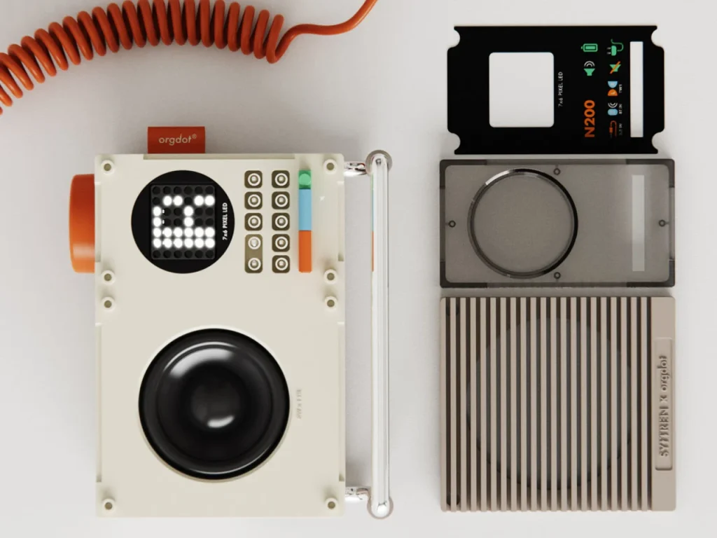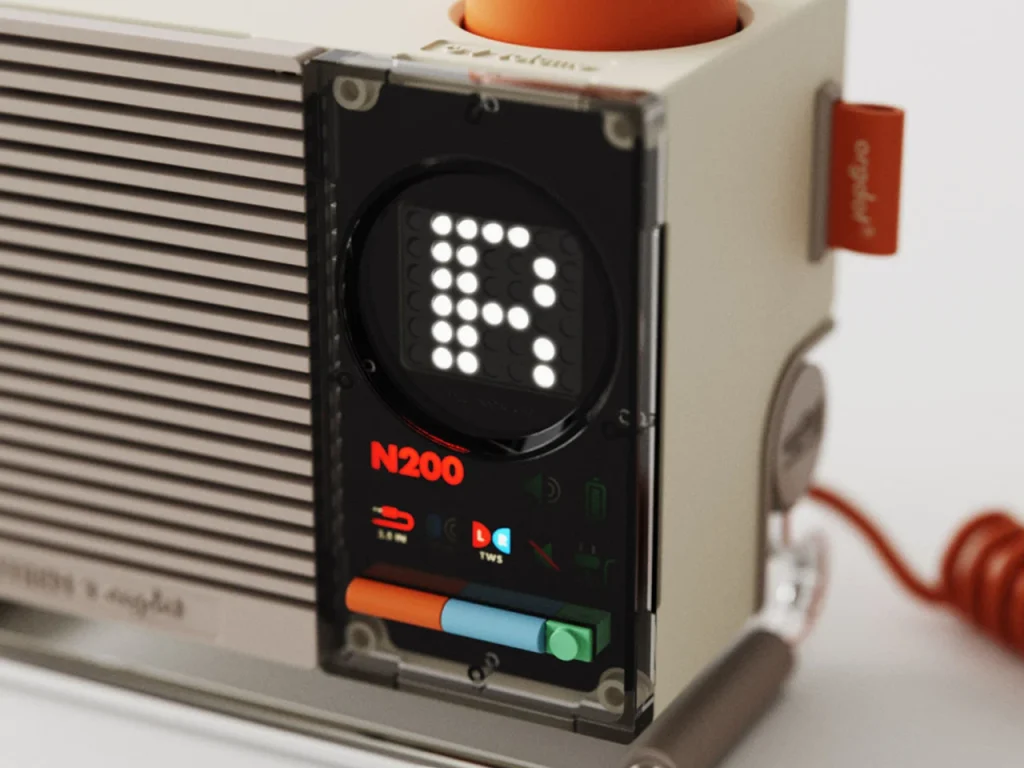 Orgdot 的 N200 桌面音箱,像从90年代科幻漫画里走出来的伙伴——低饱和米色机身、亮橙旋钮、像素点阵屏,还有可更换前面板,处处透着“可玩”的心思。它没有盲目追随极简风,反而用类乐高模块化设计和物理按键,让人忍不住想摸一摸、调一调。灵感虽被误认成 Teenage Engineering,实则出自设计师 Shu Zhang 之手,贯彻“形式追随功能”:金属支架支持多角度调节,8W扬声器支持TWS双机配对,背面保留AUX与USB-C接口,蓝牙之外仍有有线选择。点阵屏不只显示播放信息,还会“眨眼”换表情,为桌面添一丝俏皮温度。它不追求震撼低音,而是安静陪伴你的工作、发呆或深夜听歌时刻——一个有性格的声学小物。