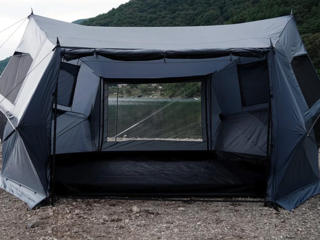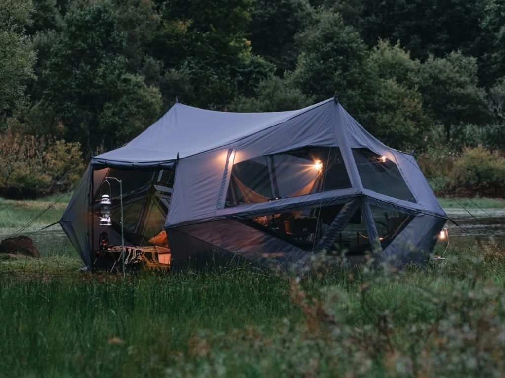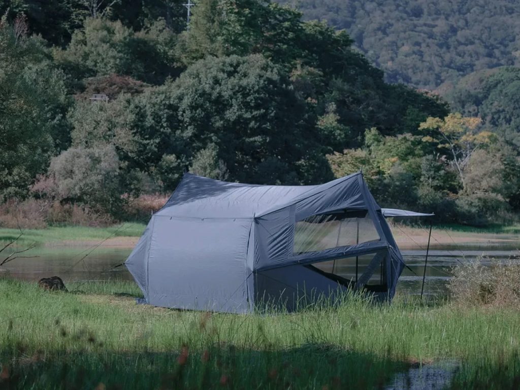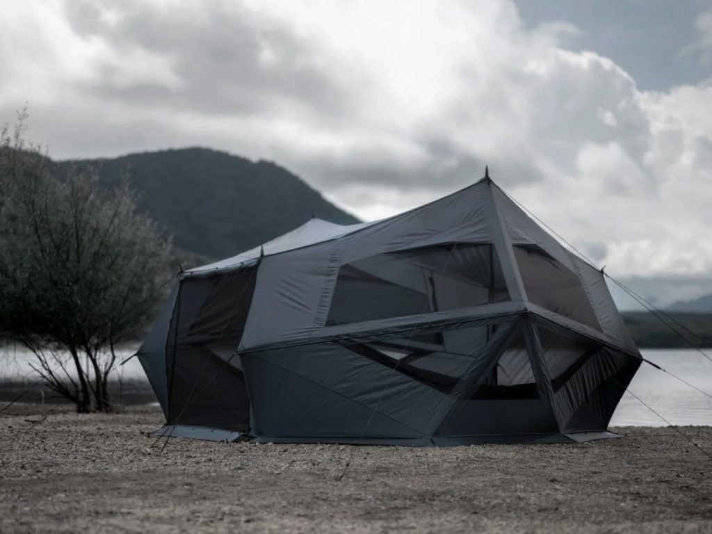 Grayhus是一款以多面体几何为核心特征的高端露营帐篷,其造型更接近空间装置而非传统圆顶结构。棱角分明的墙面不仅塑造了强烈的视觉存在感,也为大尺寸开窗提供了结构基础,使自然景观被有意识地“取景”进帐篷内部。帐篷采用模块化围护逻辑,可在通风天篷、防蚊空间与全封闭防风暴模式之间切换,经测试可抵御约55英里/小时强风。取消内置底布的设计弱化了“标准搭建方式”,释放了内部布置的自由度,使其更接近半永久性的露营空间而非一次性庇护结构。整体定位偏向豪华露营与长时间驻扎,强调造型表达、空间体验与环境适应性的平衡。