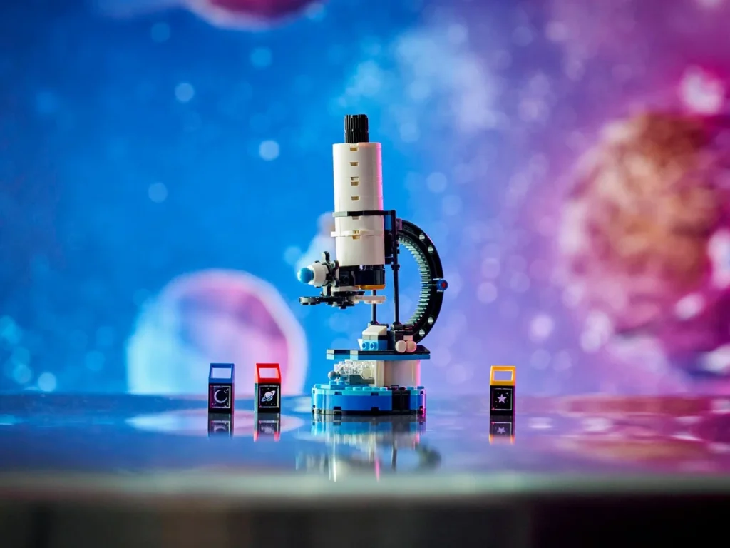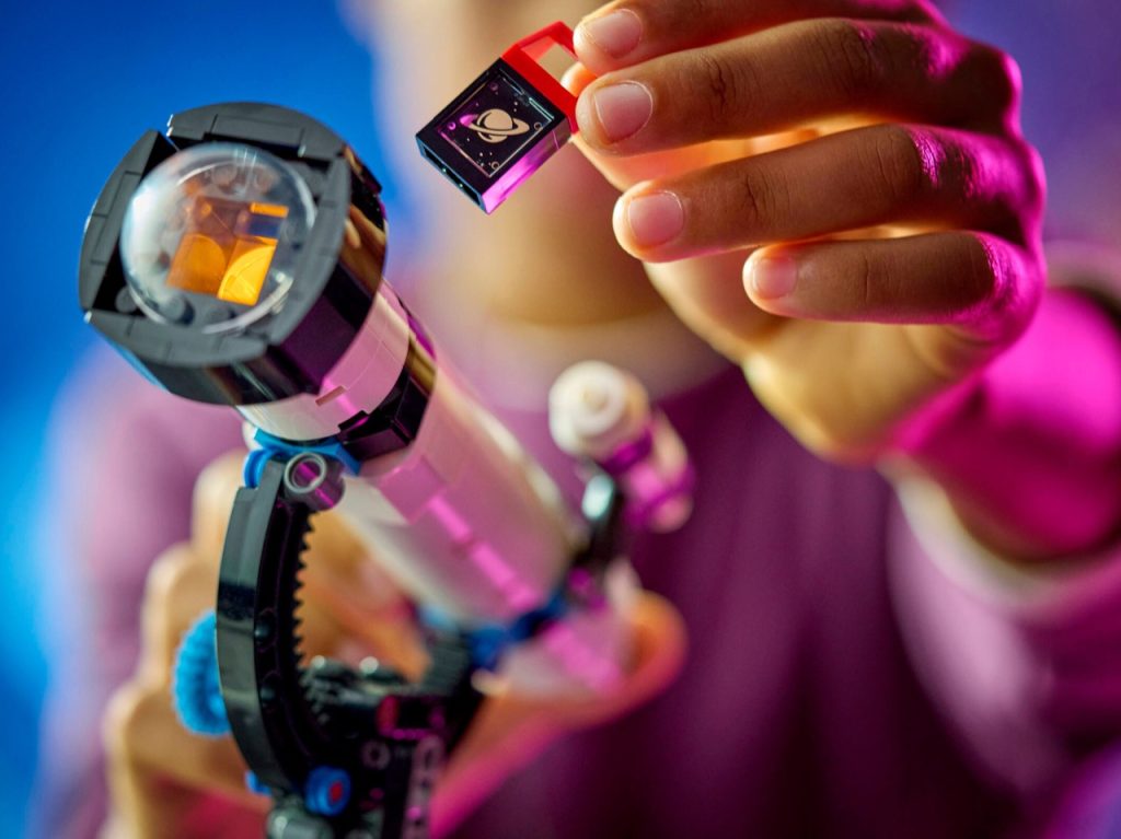 乐高Creator太空探索望远镜(编号31378)由278块积木组成,可拼搭三种不同模型:可调节望远镜、工作显微镜与可动UFO。套装巧妙共用一枚灯砖,在不同形态中分别承担投影、照明与光束效果,增强互动性。三枚印刷镜片融入行星、恒星与月球元素,兼具科普属性。主望远镜结构稳定,高约27厘米,配有可旋转的太阳系装置;显微镜通过零件重组展现功能转换;UFO则回归想象玩法。适合8岁以上儿童,是一款高重玩性、低门槛的STEM创意积木。