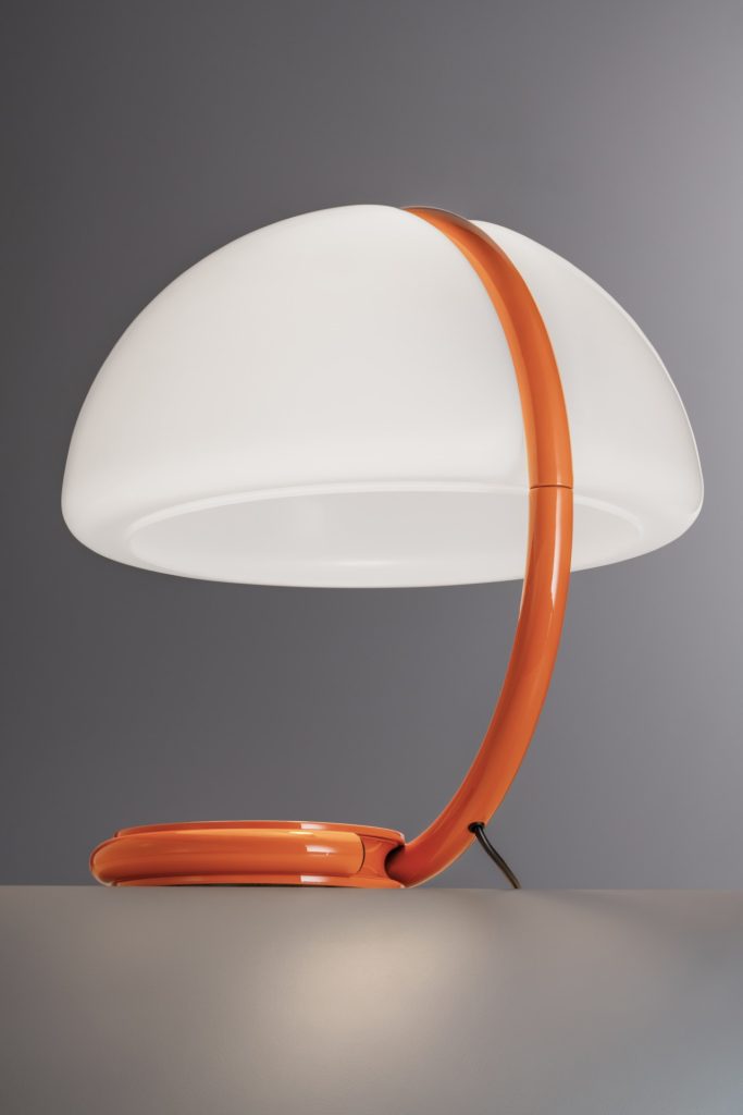 20世纪50年代,埃利奥·马蒂内利继承父亲的电器商店,并将其转型为后来的Martinelli Luce,将个人的实验精神注入灯具设计之中。1965年诞生的Serpente灯具,以蛇形般流畅的造型和旋转灯臂结构成为品牌代表作。其漫射器可360度旋转,光线随姿态自由流动,兼具实用性与强烈的动态表现力。Serpente采用当时前沿的热成型工艺,实现复杂曲面与底切结构,是形式、功能与制造实验的高度统一。60年后,Serpente以纪念版橙色回归,这一充满能量的色彩既呼应波普艺术时期的乐观精神,也象征着品牌始终延续的创造力与生命力。