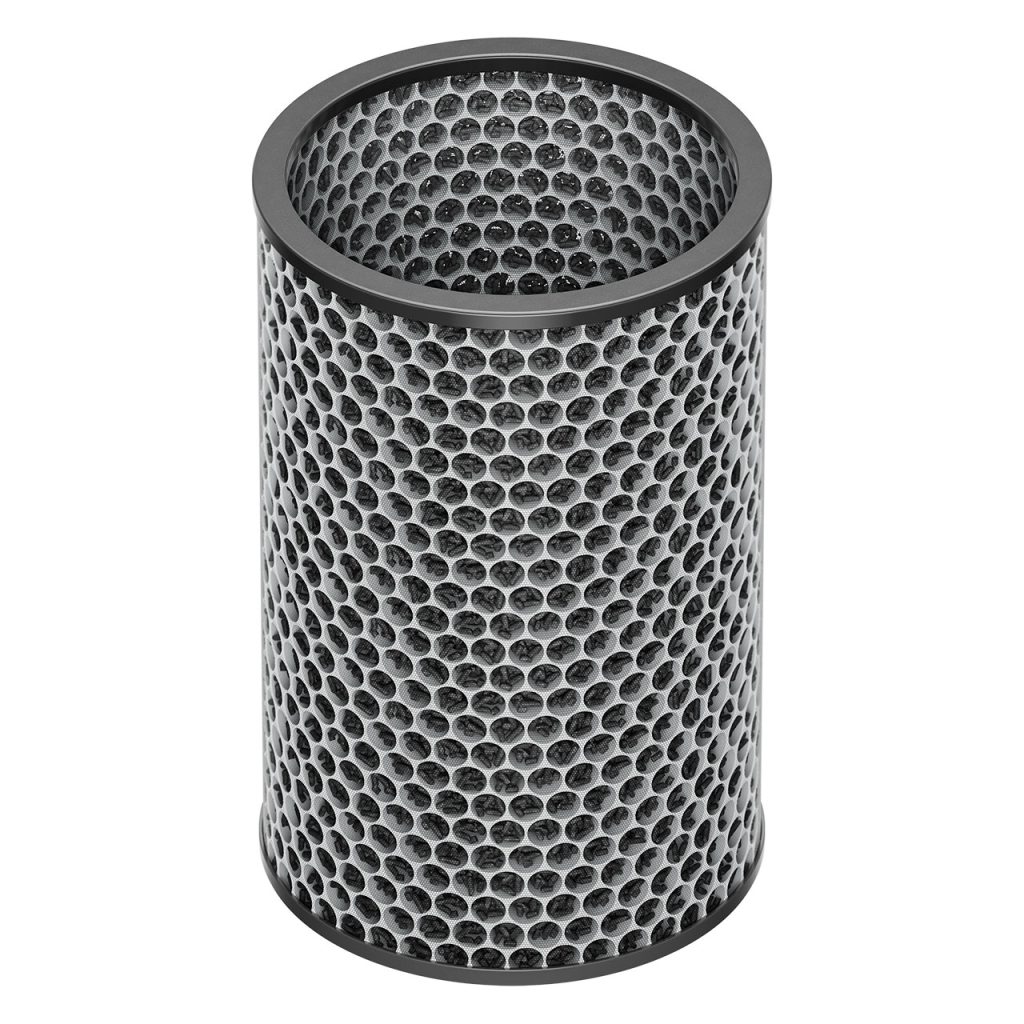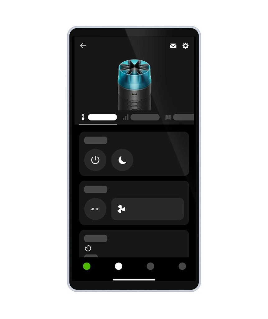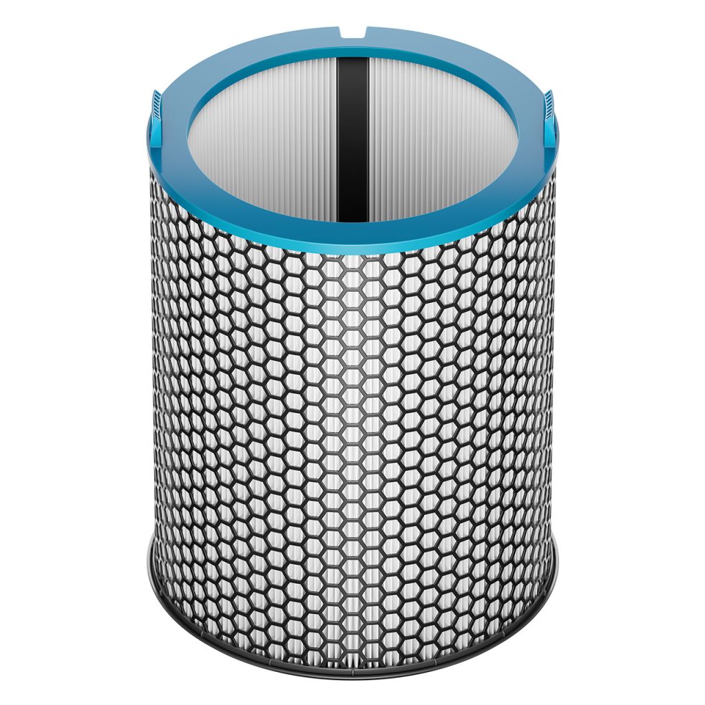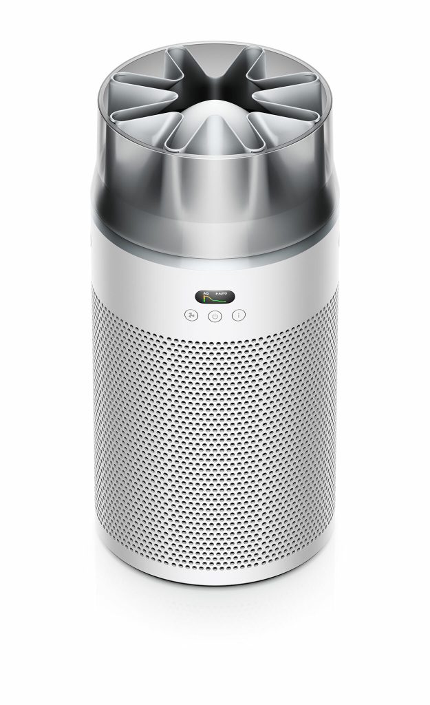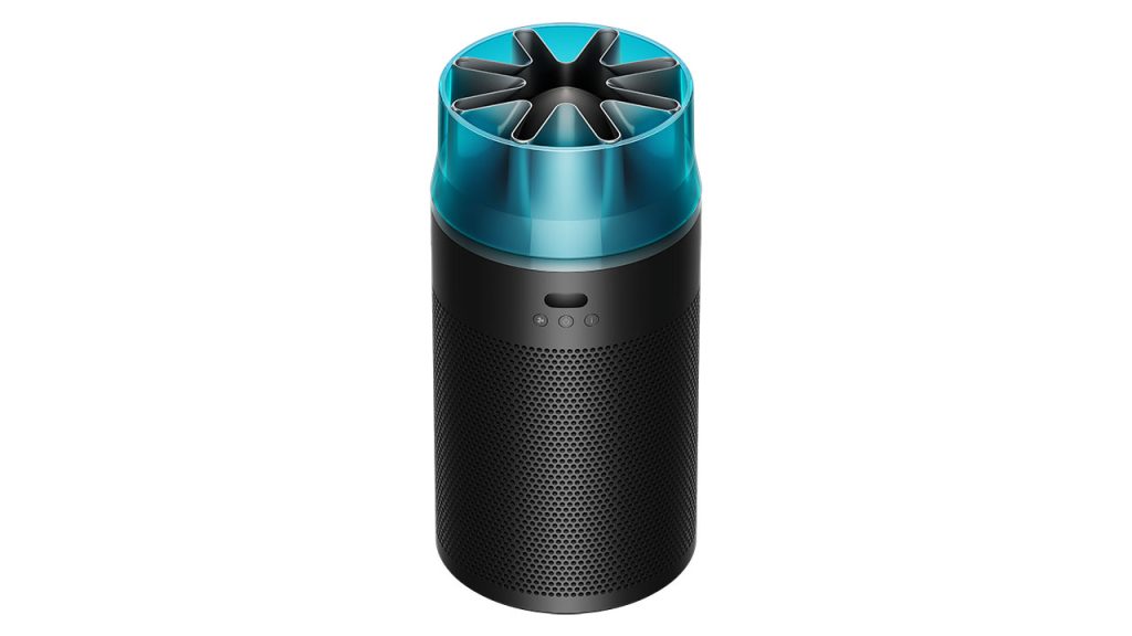 Dyson HushJet是一款面向小户型空间的锥形迷你空气净化器,通过将风道系统与星形喷嘴结构整合进机身内部,实现高风量与低噪音的并存。其集风嘴原理类似吹风机风嘴,用于平滑高速气流、减少湍流,从而降低空气动力噪声。设备在睡眠模式下噪音约24dB,可过滤99.97%直径0.3微米以上颗粒物,CADR约250 m³/h,适用于约21㎡房间。静电滤网寿命约5年,明显长于常规产品。外观采用浅灰或黑蓝配色,造型更接近小型建筑构件而非传统家电,减少对室内视觉秩序的干扰,并适应隐藏式摆放需求。
