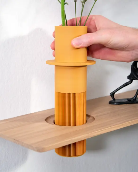 这是一款将置物架与花瓶功能融合的模块化家居收纳系统,被称为全球首款内置花瓶的层架设计。产品通过将植物容器安全地整合进架体结构中,使绿植不再是容易倾倒的独立摆件,尤其适合有儿童或宠物的家庭使用。三段式模块化结构可自由组合、扩展,安装简便,支持不同颜色与造型的混搭,满足个性化室内搭配需求。设计在强调功能安全性的同时兼顾美感表现,让绿植成为空间秩序的一部分,可灵活应用于客厅、厨房或衣帽间,提升居住空间的活力与层次感。