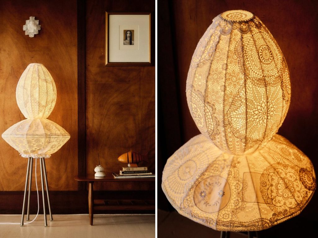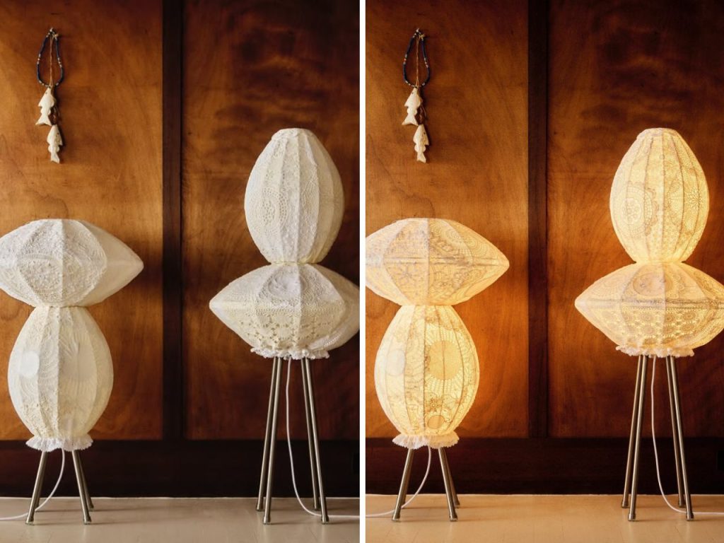 这是一款名为Kinship 系列的蕾丝灯罩落地灯,由设计师 Lana Launay 创作,将家族传承的织物手工蕾丝、旧布片、袜子等纺织遗物转化为精致的照明艺术品。设计通过将这些历史悠久且带有痕迹的纺织品拉伸并包裹在不锈钢框架上,再配合内置 LED 光源,使光线透过纤细的线片投射出复杂的阴影与纹理,呈现出既朦胧又富有层次的光影效果。灯具在未点亮时呈现安静抽象的雕塑形态,而点亮后则将织物的细节与记忆投射到空间中,塑造出兼具视觉与情感深度的灯光叙事。此作品更像是“活着的档案”,让历史织物在当代空间中延续其生命与故事。