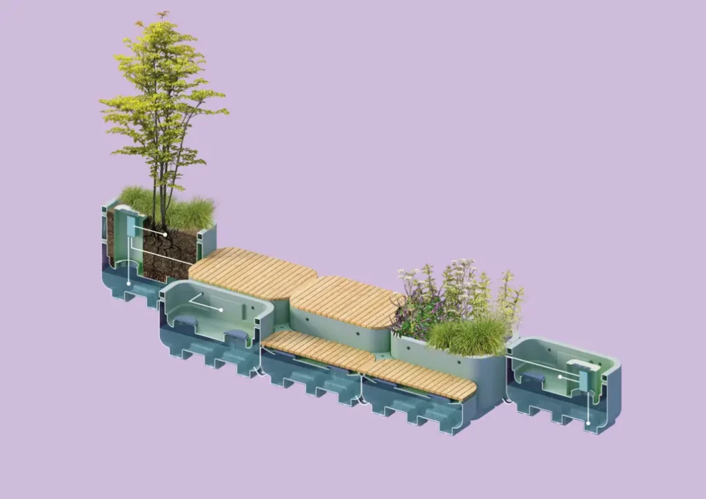 通过模块化与太阳能灌溉系统,该设计将生态功能融入公共家具之中,使城市空间更具绿色与社交属性。