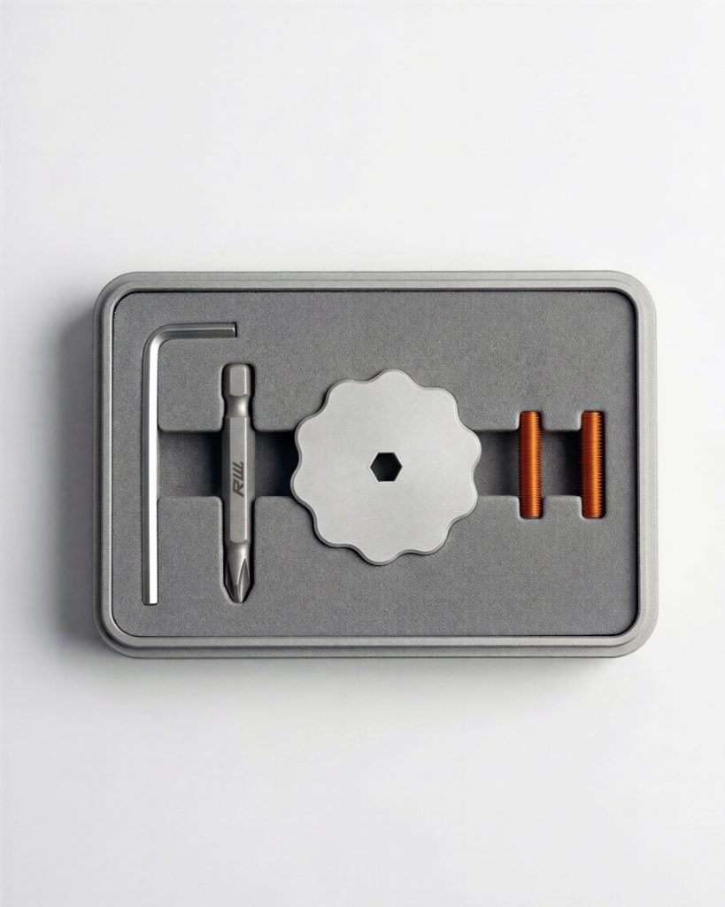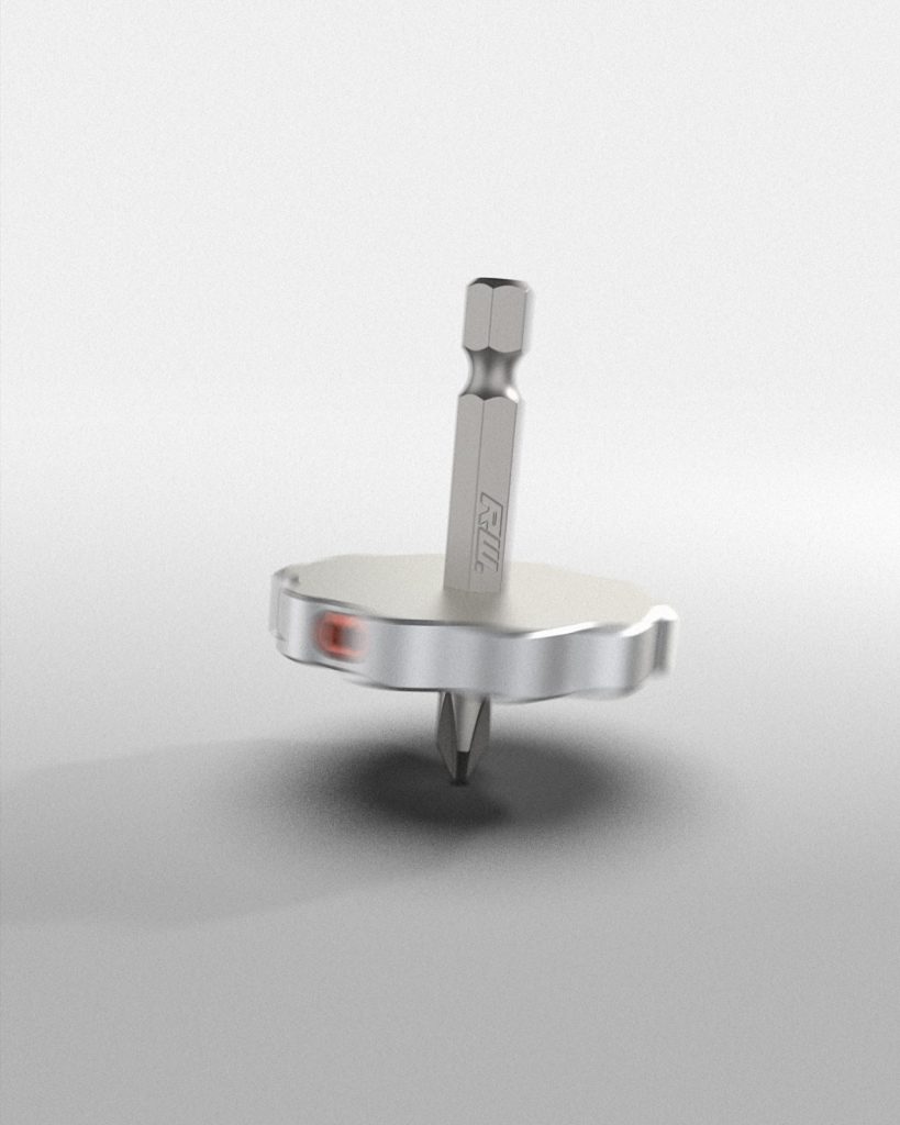 Drillbit Gyro将工具与玩具属性结合在同一物件中。其核心结构基于标准1/4英寸六角钻头,通过主体两侧的紧定螺钉固定,使钻头既可作为螺丝刀使用,也成为旋转轴心。主体采用花形轮廓设计,既提供抓握摩擦力,也在旋转时形成清晰的视觉轨迹,使其具备陀螺般的可玩性。模块化结构允许用户更换不同类型的钻头,实现基础螺丝刀功能。整体材料与加工方式较为简单,结构部件少,具备可量产性。设计重点并不在于提升专业工具效率,而是通过形式与交互的轻度趣味性,打破EDC工具常见的“战术化”“硬核化”审美,使工具在功能之外具备桌面把玩与情绪价值。