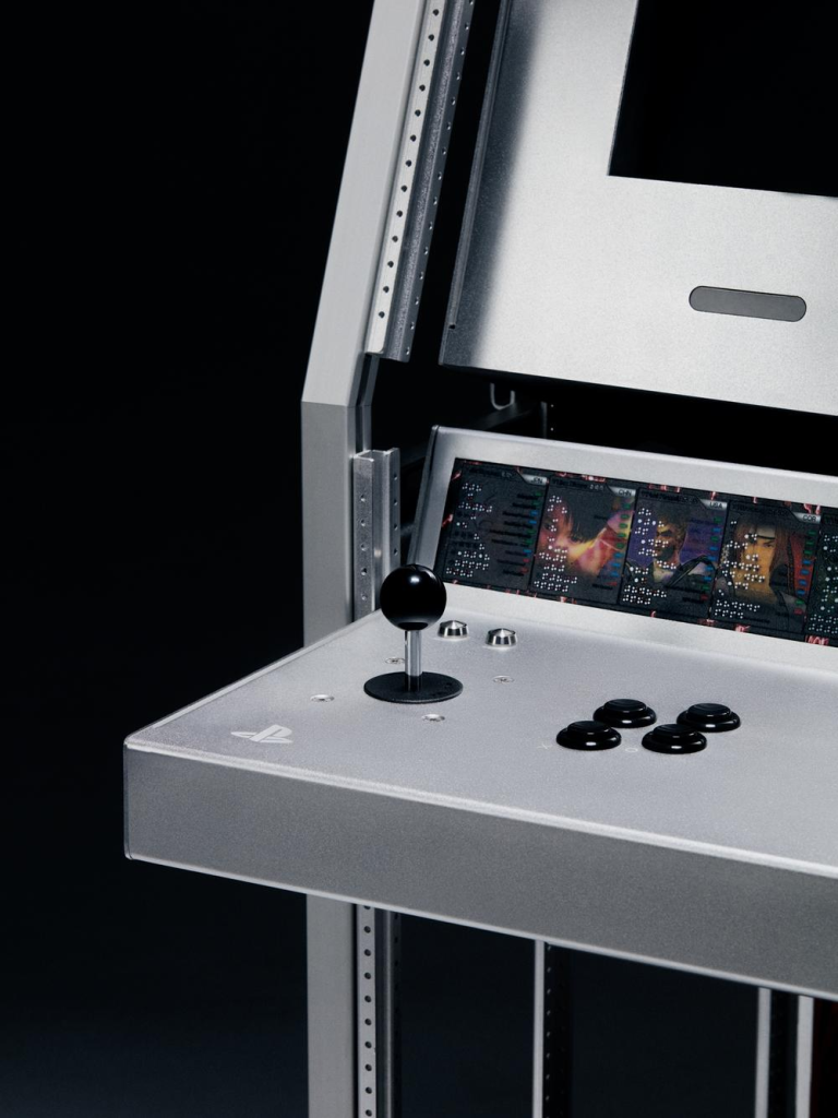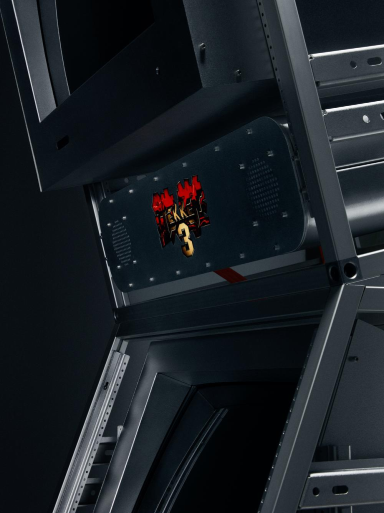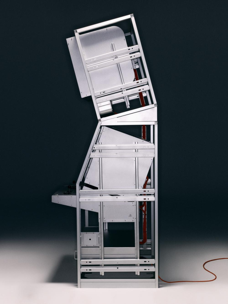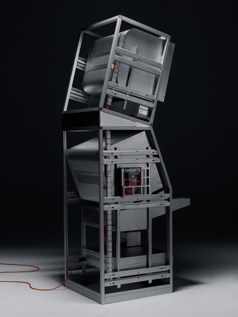 Tekken以经典的服务器为原型,通过透明结构框架与金属板材构建整体机身,使内部结构与电子组件被清晰展示,形成类似工业设备或实验装置的视觉效果。设计在保留传统街机交互形式的同时,采用喷砂阳极氧化铝材质加工技术,并以橙色点缀强化机械美学,使娱乐设备转化为具有展览属性的设计对象。