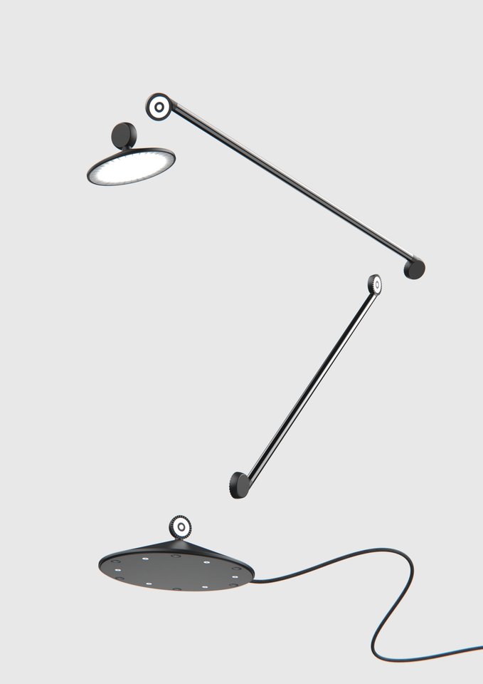 关节灯用久了会怎样?弹簧松,关节垮,灯泡垂头丧气。ECAL学生Mael Sandoz给了一个新解法:扔掉弹簧和螺丝,全换成磁铁。这盏叫“断奏”的台灯,每个关节里都藏着带缺口的轮子和磁铁。磁力固定位置,想掰到哪里就停在哪里。更妙的是,磁铁还兼职导电,电流从底座一路传到灯头,不需要额外走线。底座是导电塑料做的,手指轻轻一碰,开灯关灯。整盏灯没有任何焊接点,组装靠吸,关节靠吸,通电也靠吸。Sandoz说还可以加第三段手臂——当然,底座得加重才行。