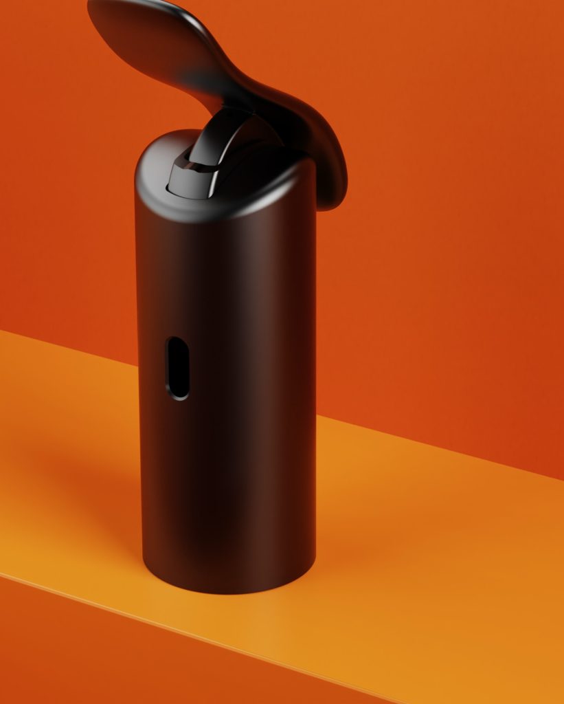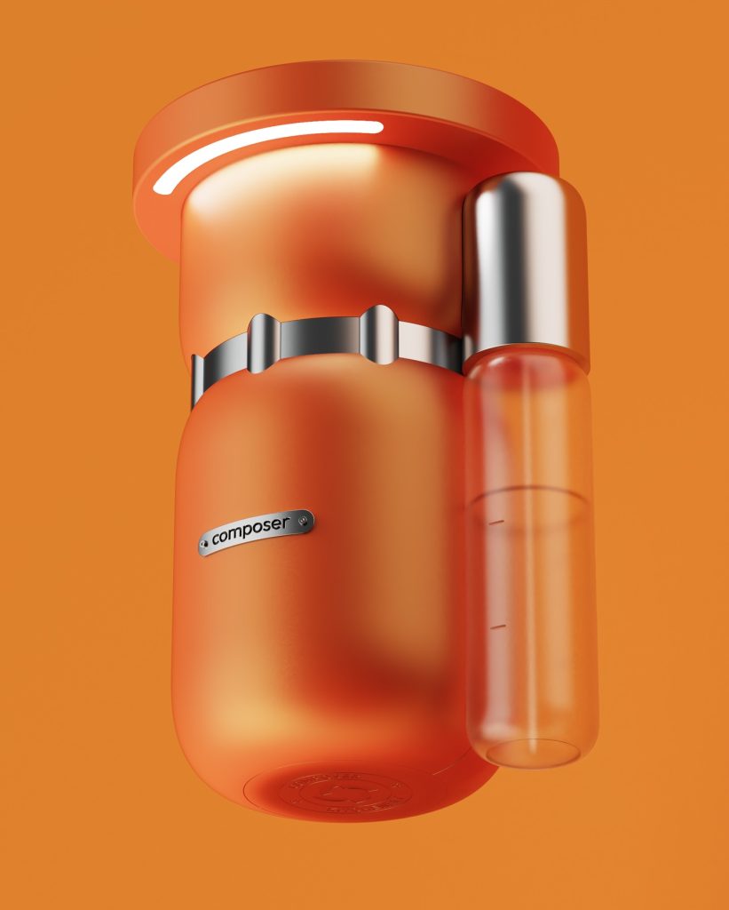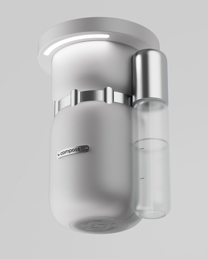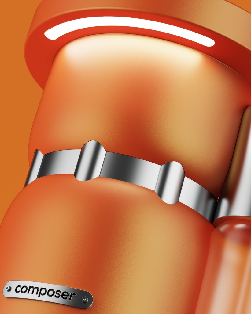 Composer厨房垃圾处理器以专利机械虹膜与杠杆系统为核心,实现对下水投放的可视化与触觉化控制:半开虹膜在允许水流通过的同时阻挡大体积残渣,完全开启并持续按压杠杆即可触发研磨。其结构语言借鉴航空航天中的肋状支撑体系,并转译为更柔和的几何形态,以适配家庭场景。CMF设计以果蔬色为灵感,弱化传统设备的冷硬感;可替换杠杆饰面(不锈钢、黑色、黄铜)则与厨房五金体系形成统一。整体在机械表达与日常使用之间建立清晰秩序。