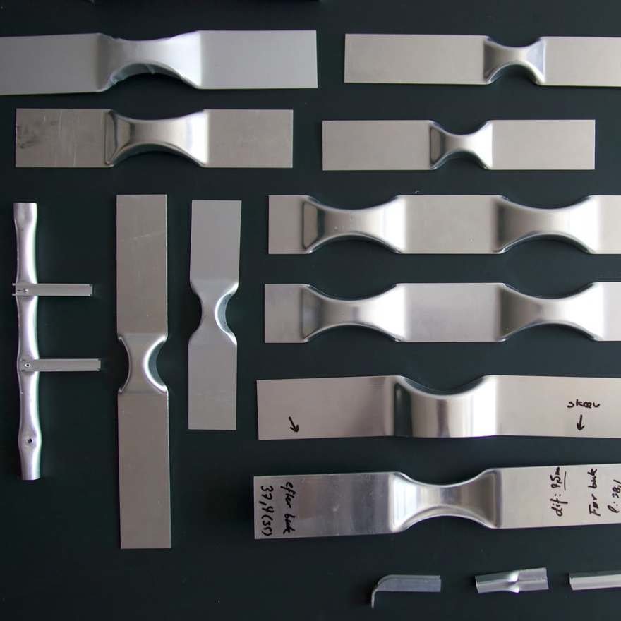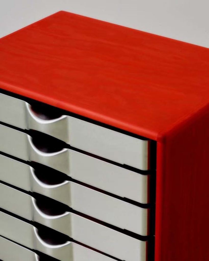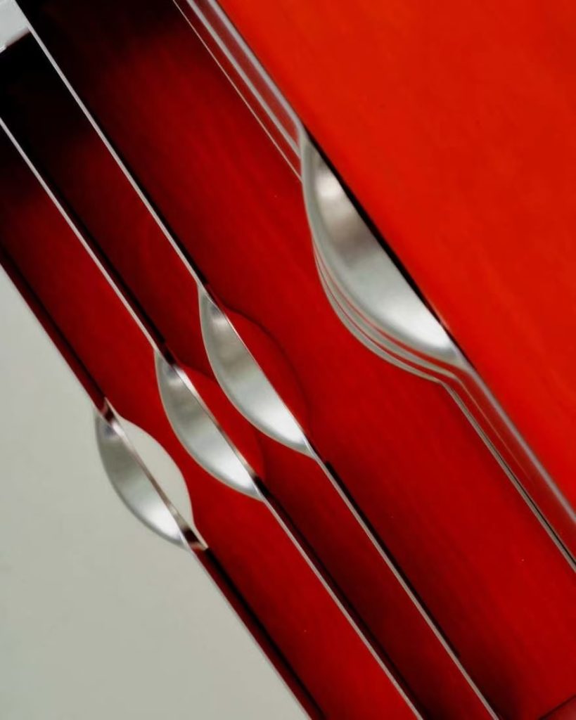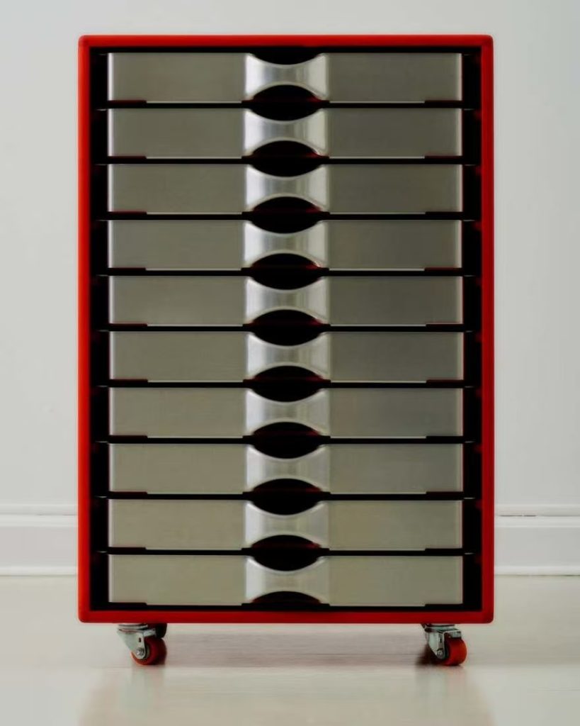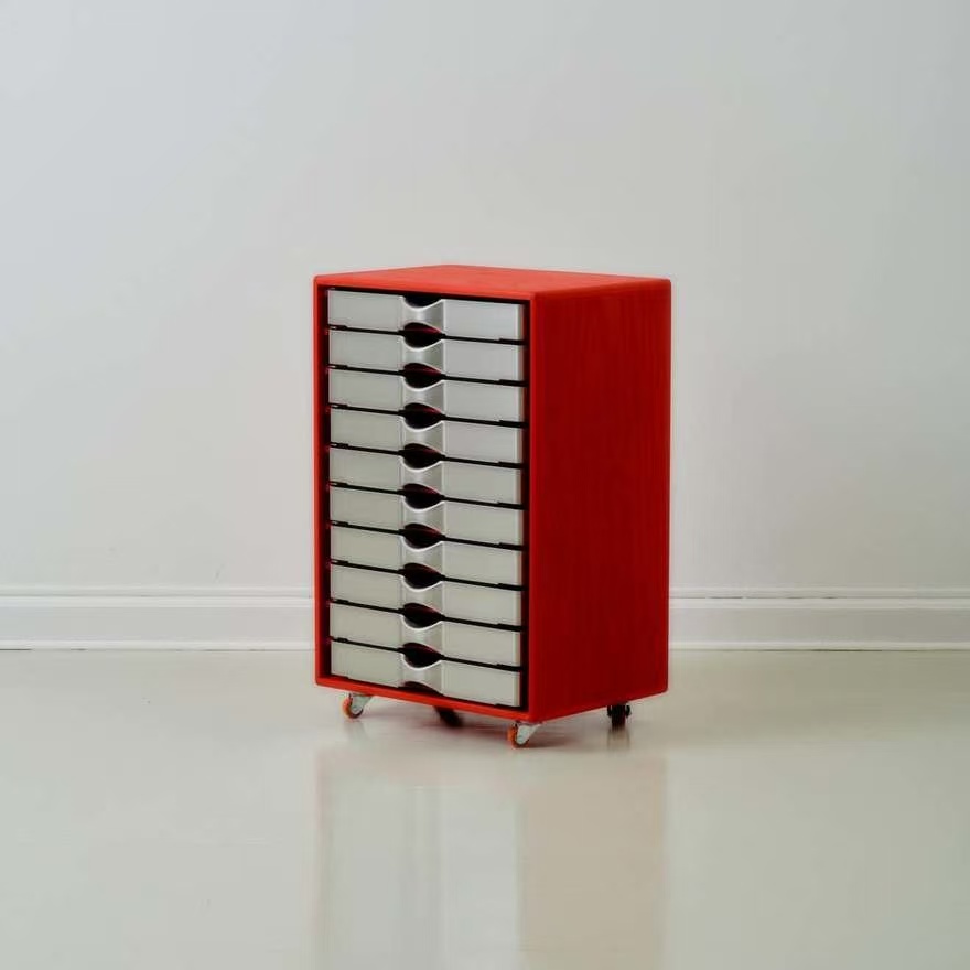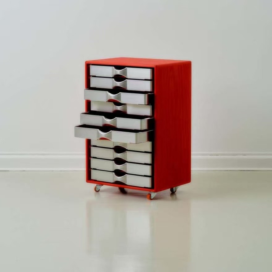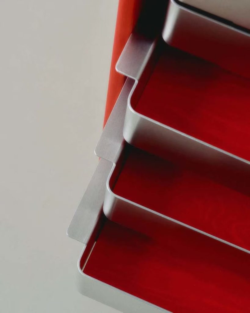 丹麦有个叫 Tools 2 的展览,请设计师们玩一台工业压床。Alvilde Holm 接过这个命题,琢磨了一阵,交出的答卷是这组抽屉。外壳是木头,抽屉是铝板压出来的。压机一上一下,铝板服服帖帖地变成抽斗的形状,边缘利落,表面带着工业加工特有的干脆劲儿。木头壳子反倒成了配角,安安静静地兜着这几个金属小家伙。整个作品没什么花哨的装饰,就是从工具出发,顺着材料的性子走。压机能做什么,铝能变成什么,试完了,答案就在这儿。