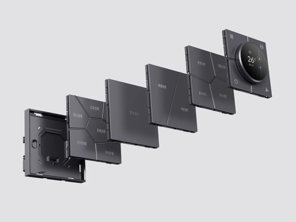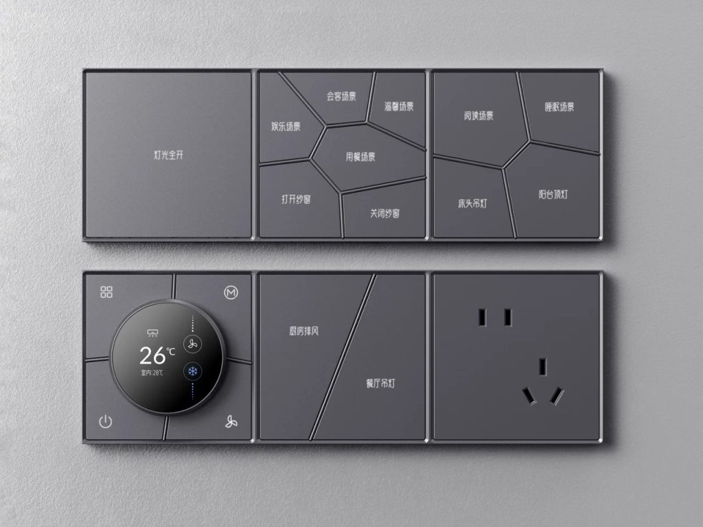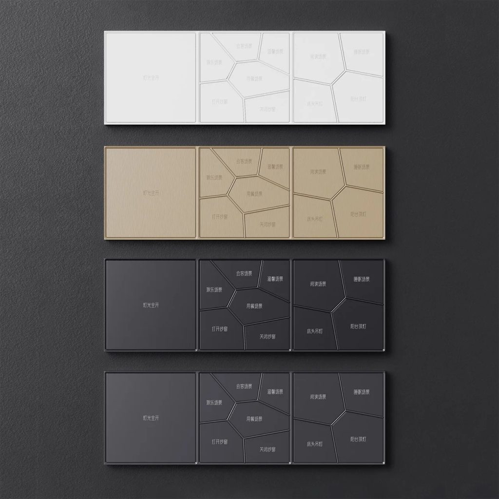 Inkslab智能面板是由HDL Automation团队设计的一款墙面控制系统,其核心理念是将中国古典园林的镂空窗美学,转化为墙面开关的交互界面。面板表面被分割成从中心向外辐射的不规则多边形单元,每个单元都是一个独立按钮,将装饰与触控融为一体。系统采用模块化设计,支持水平或垂直拼接,可自由组合场景选择、空调旋钮、电源插座等功能模块。提供拉丝香槟金、哑光黑等四种配色,金属版本采用阳极氧化铝工艺,非金属版本则使用亲肤涂层,整体厚度仅10毫米,贴合墙面。面板内置接近传感器,可学习用户习惯并主动推荐场景。