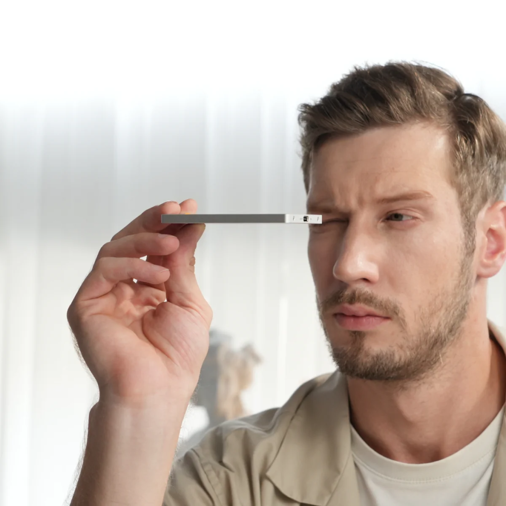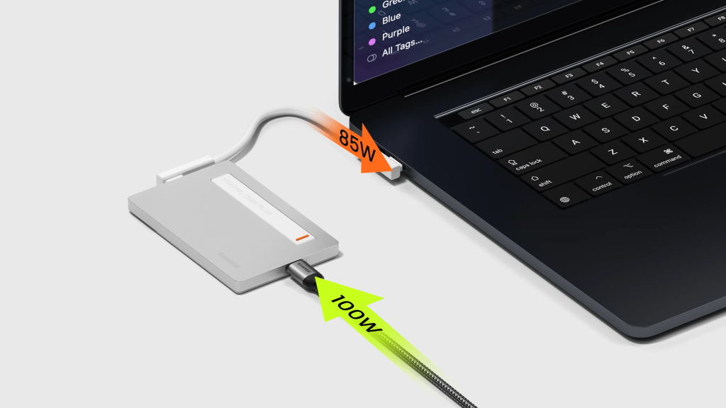 产品厚度仅约0.24英寸,采用全铝机身与极简结构设计,强调如“隐形设备”般贴合手机或电脑使用场景 。其核心功能为支持M.2 NVMe固态硬盘扩展(最高4TB),并支持PD 100W充电输入,使用户在数据读写的同时为设备持续供电 。