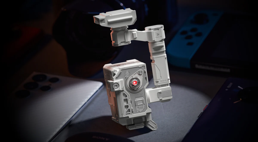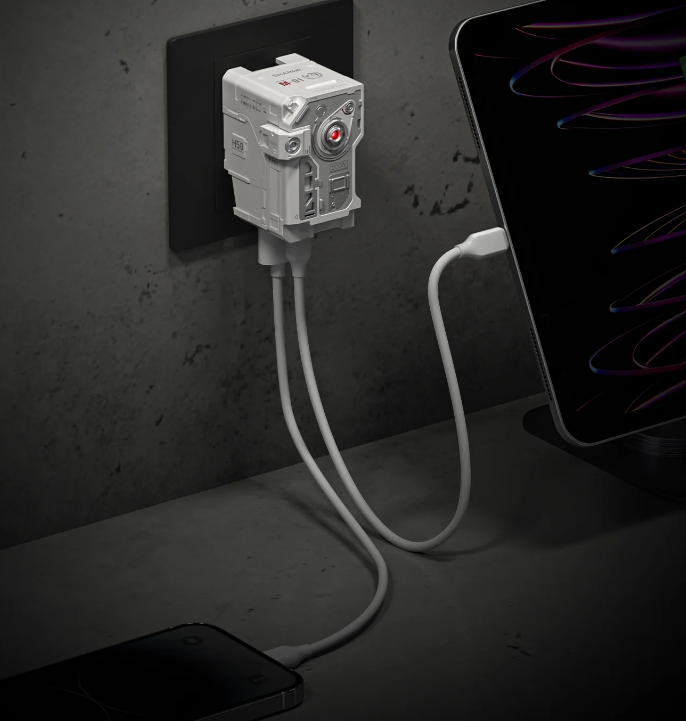 该产品主可同时为两台设备进行快速充电,兼容PD、QC等多种主流协议,覆盖手机、平板乃至部分笔记本设备。在设计上,其通过机械臂支架与可更换屏幕贴纸,强化设备人格化的表达,成为桌面视觉中心。