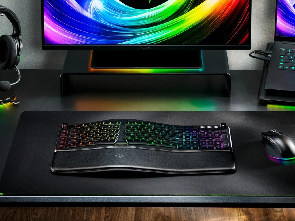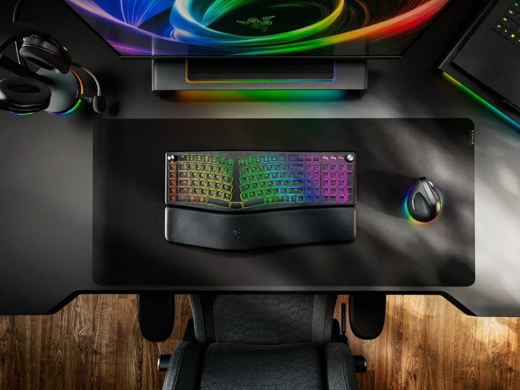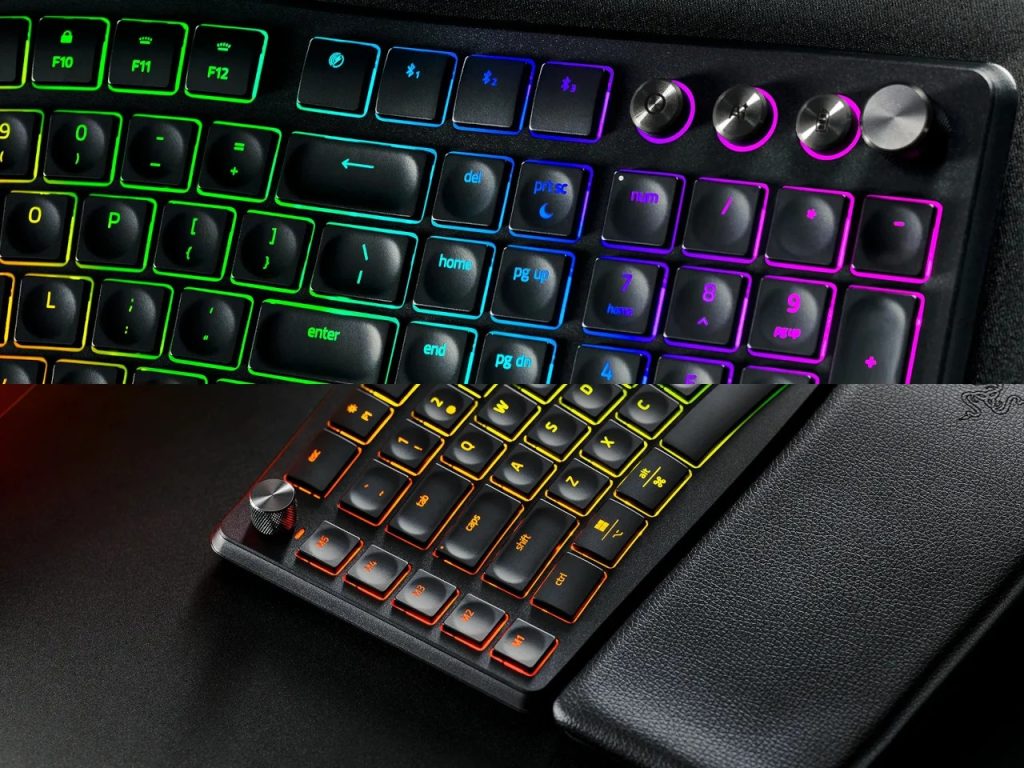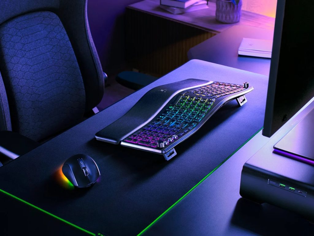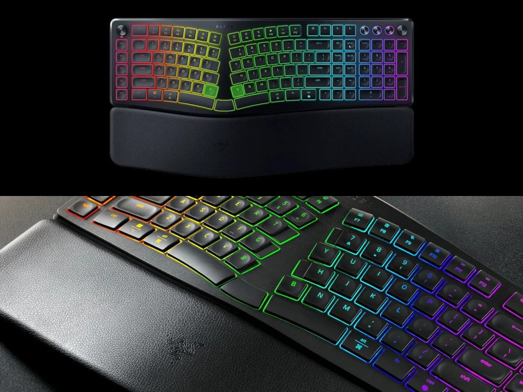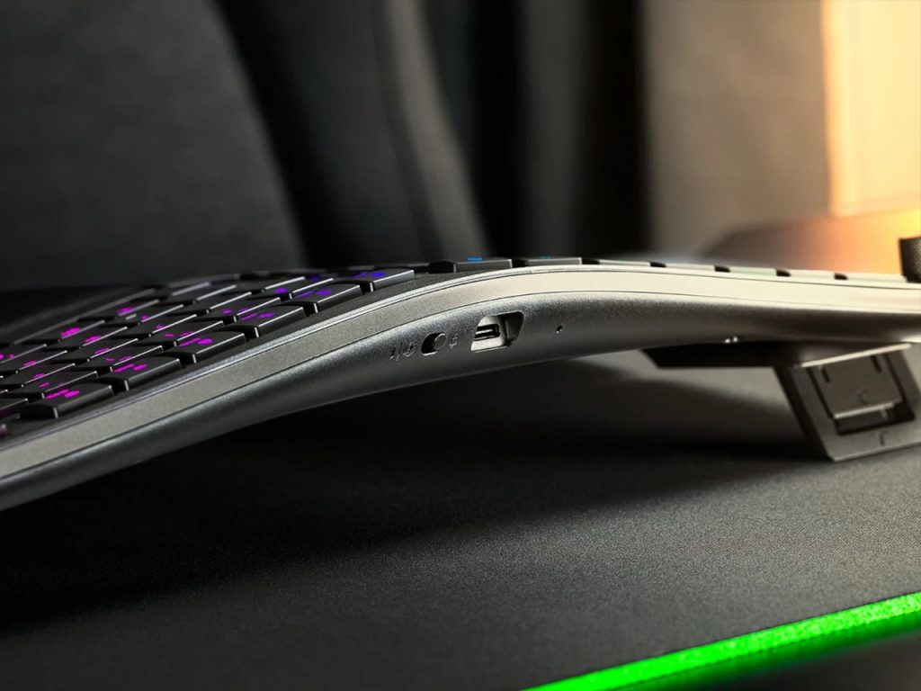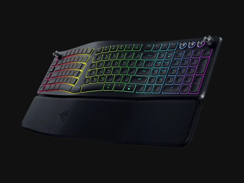 Razer Pro Type Ergo是一款无线分体式人体工学键盘,采用自然舒适的键位布局,配备双“B”键和拇指退格键。集成腕托支持10度底座及前后各7度倾斜调节,超薄键帽带球形凹槽,打字安静省力。左侧设有五枚宏按键和Razer Command Dial,并带有一键调用AI功能的专用键。支持2.4GHz、蓝牙及USB-C三模连接,可同时连接五台设备,RGB背光可自定义或关闭。售价189.99美元。