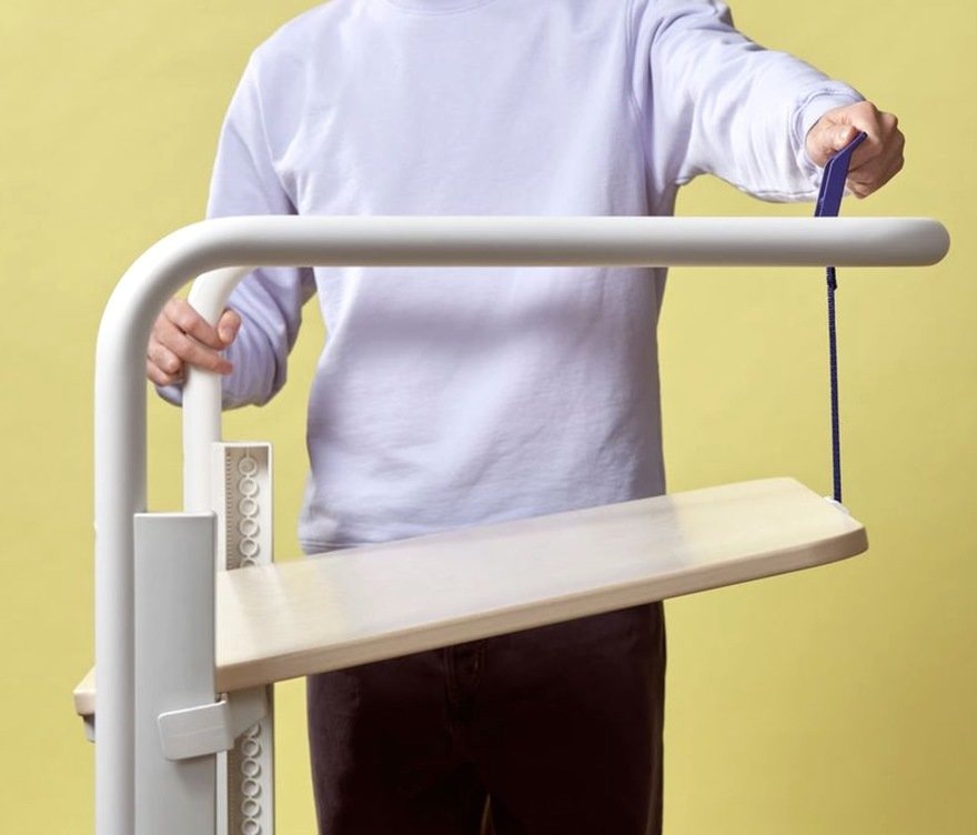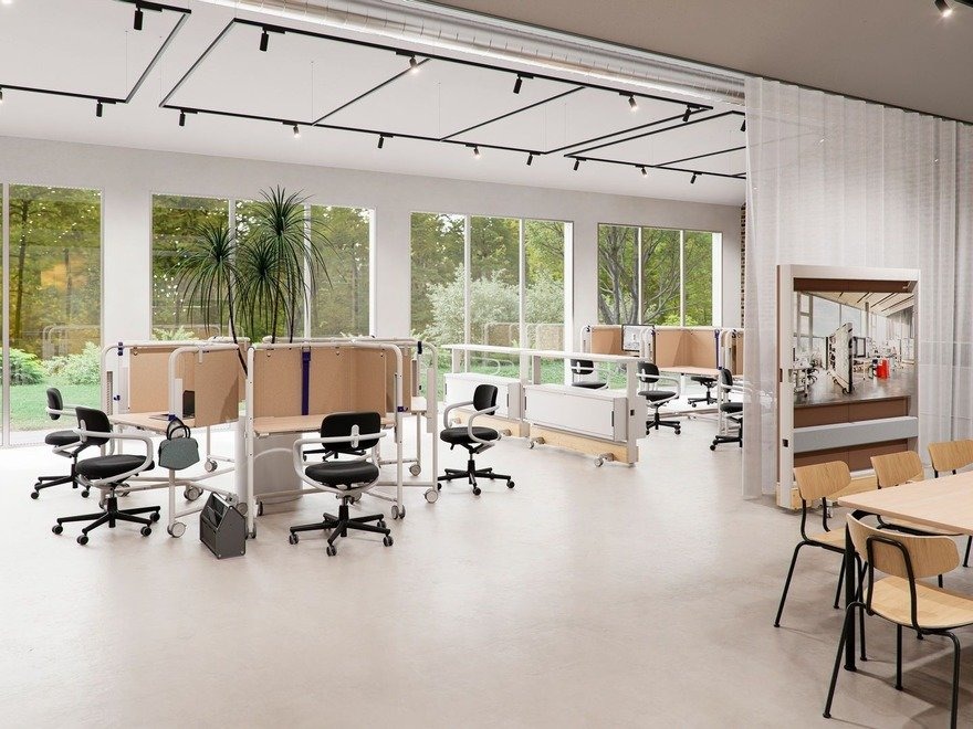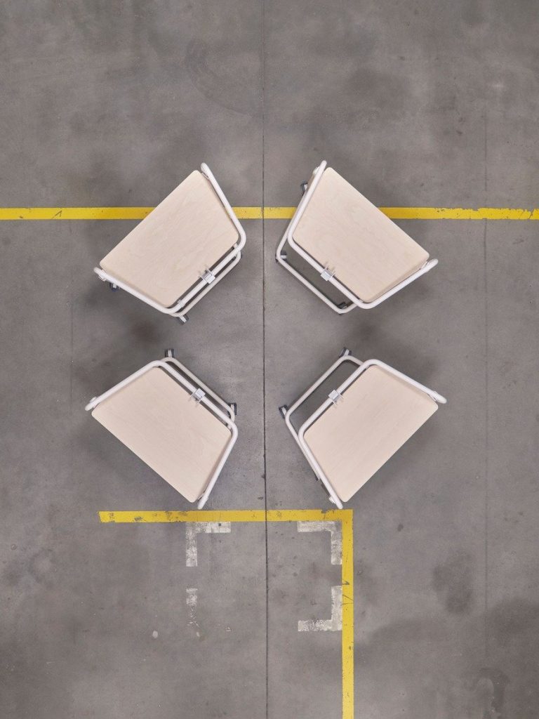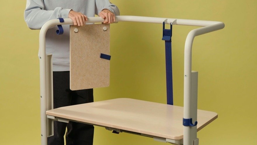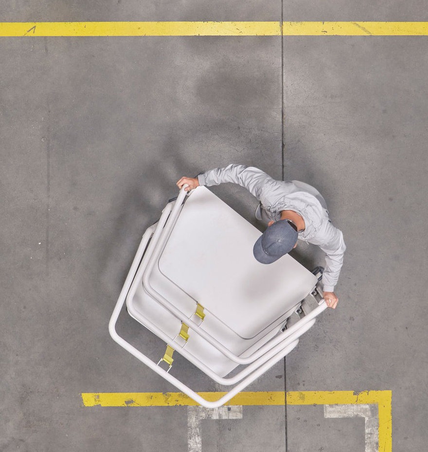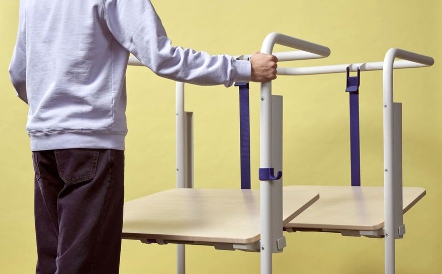 Konstantin Grcic 为 Vitra 设计的 Scout Work Mobile,是一张梯形小桌。钢管框架不只是结构,两侧伸出抓握点,挂隔板、挂包都行。桌腿配了轮子,推着走不费力。高度用手动履带调节,不用电。背后的带子能让桌面倾斜,方便多张叠放收纳。需要临时工位、协作讨论,拉过来就能用。不用了,推到墙角叠起来,不占地方。没有花哨的功能,每个细节都在服务“移动”和“收纳”这两件事。