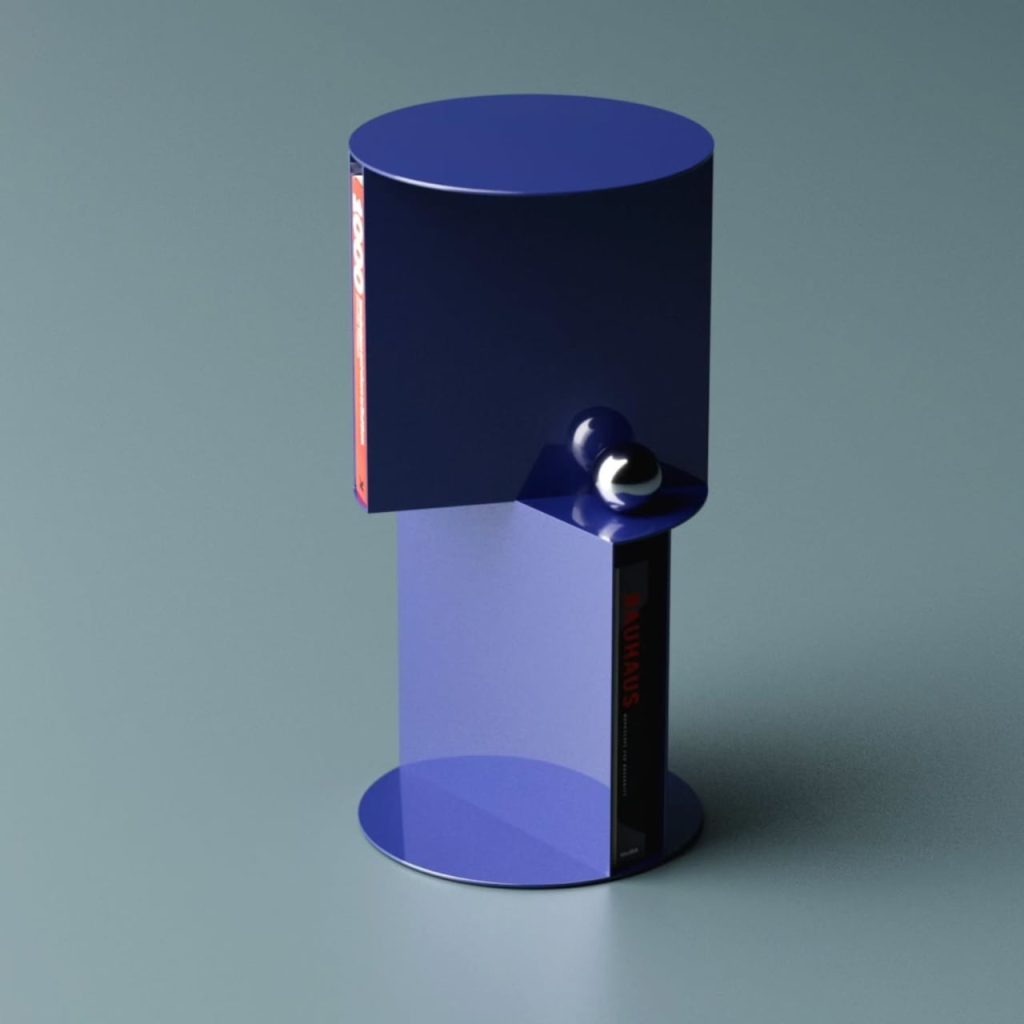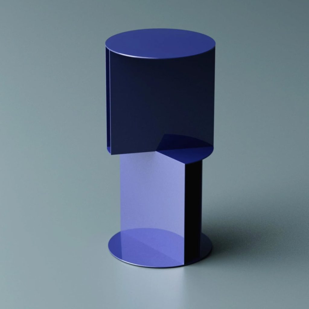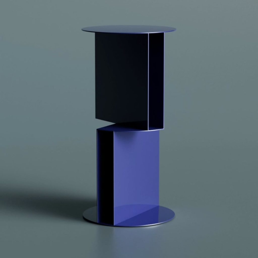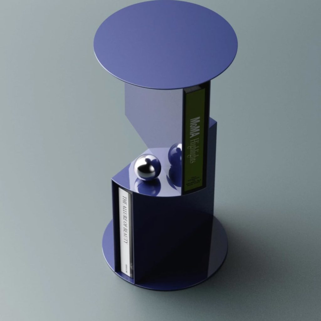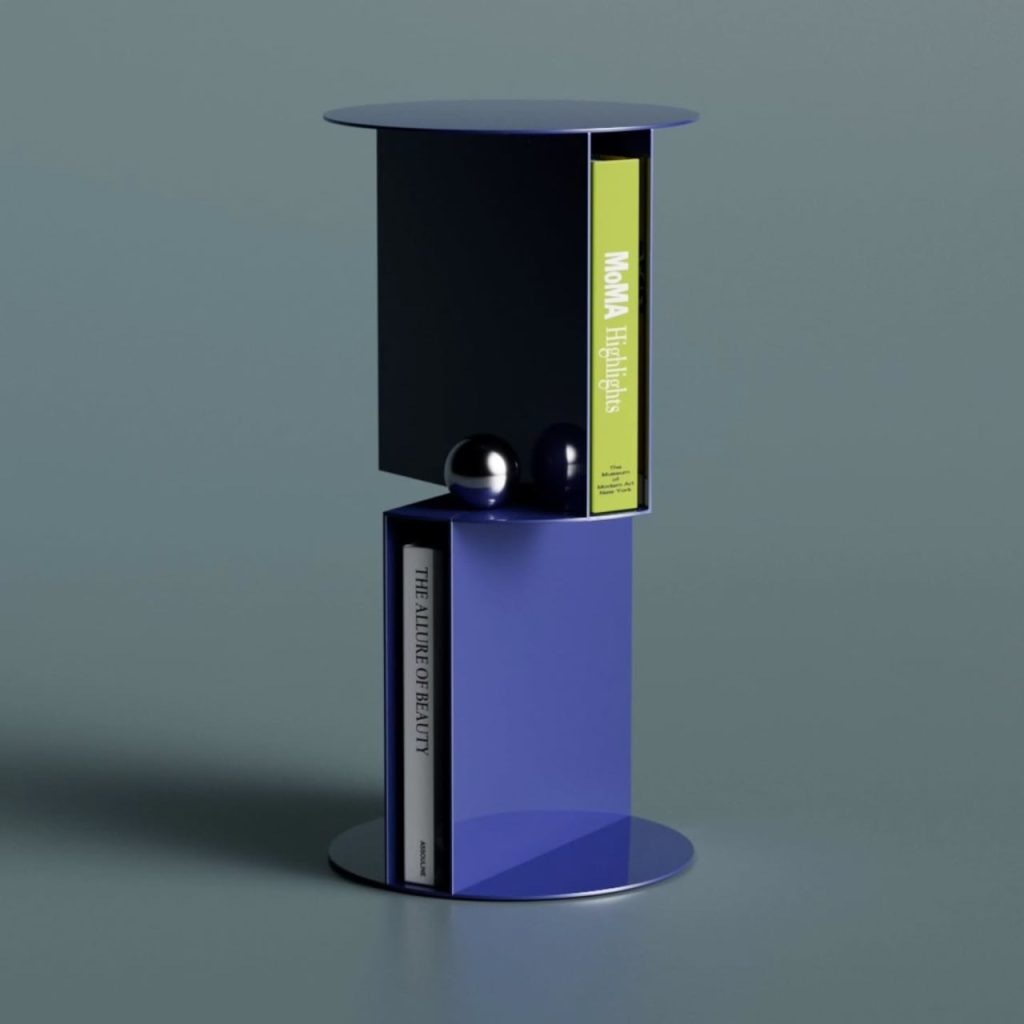 Deniz Aktay 设计的这张边桌,没有腿。两个金属储物单元叠在一起,彼此错开一个角度,撑起了整张桌子。一个朝左开,一个朝右开,中间交汇处自然多出一层小搁板。三个储物空间,就这么被结构带出来了。深蓝配亮蓝,上下对撞,视觉上像桌子拧到一半被定格。书本直接立在弯曲的隔间里,不用额外支架。顶部圆盘放杯子,底部平盘接地。没有传统框架,没有多余零件。结构自己把话说明白了,不用额外解释。