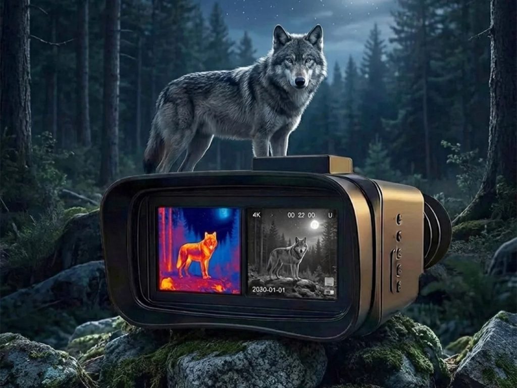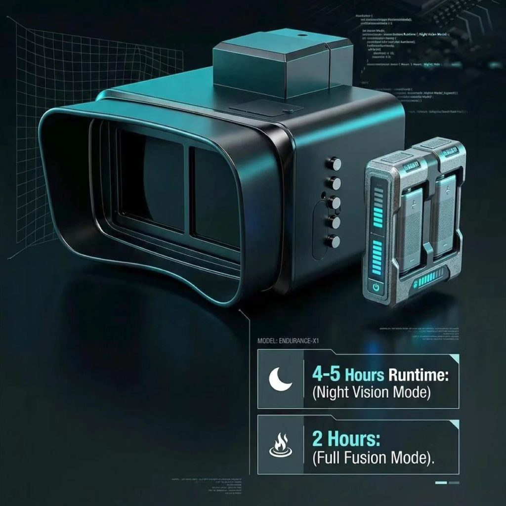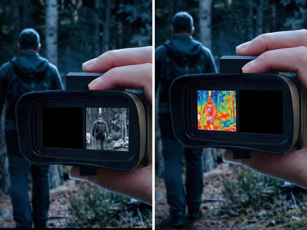 SpectraEyes 是由丹佛团队设计的一款双目热成像与夜视融合设备,其核心理念是 “让热探测与细节识别同时并行,不再需要在两者之间做选择” 。它采用双独立显示屏系统:左侧为60Hz热成像传感器(12微米像素间距,NETD<25mk),右侧为4K超低光CMOS(0.0001勒克斯下全彩成像),分别显示热信号与环境细节,大脑自然融合两路信息。设备支持单侧独立运行以节省电量,热探测距离500米,夜视可达800米,配备850nm/940nm双波段隐蔽红外照明。IP67防水,工作温度-20℃至50℃,可更换锂电池,支持4K录像与microSD卡存储。