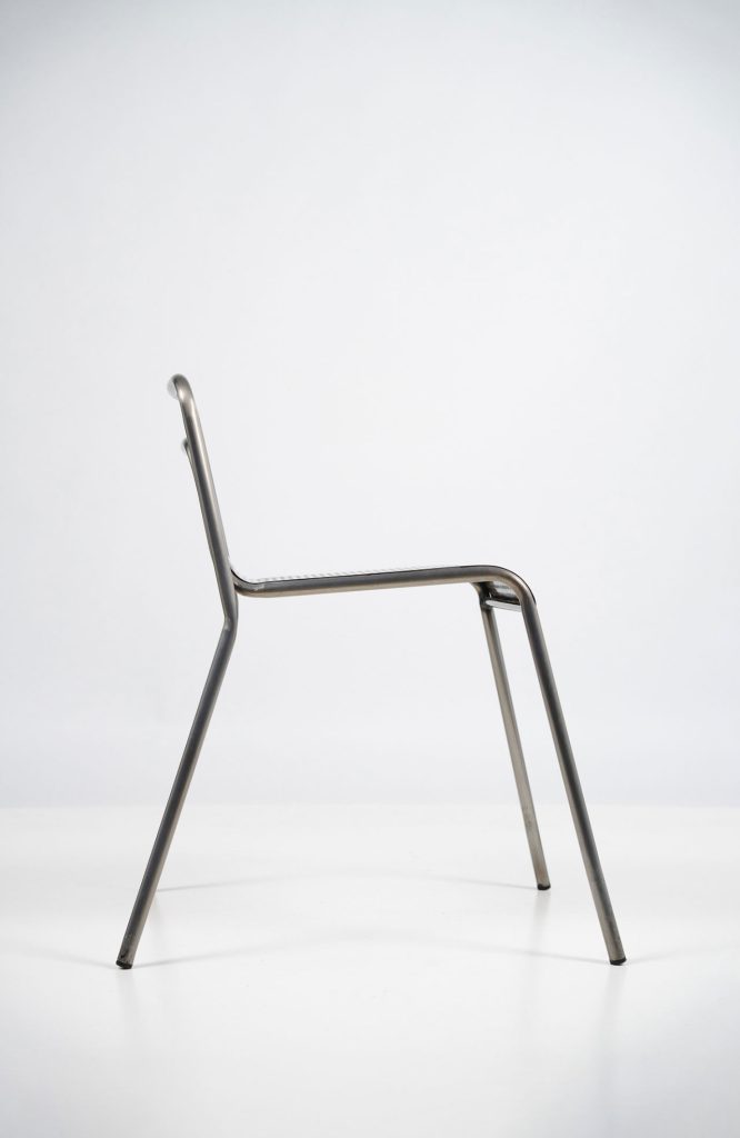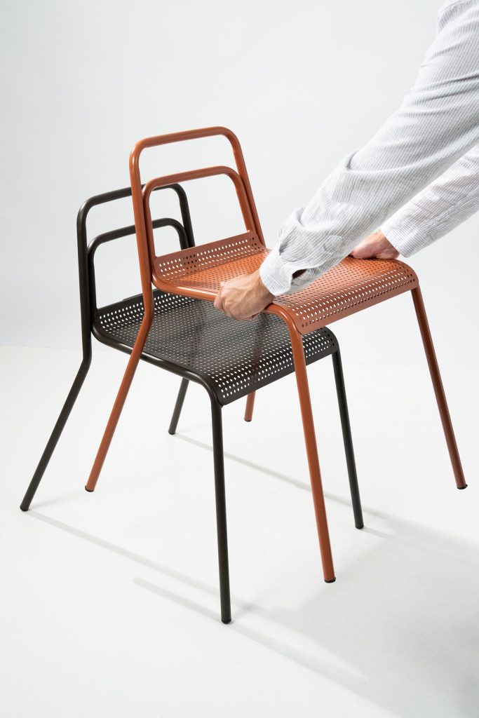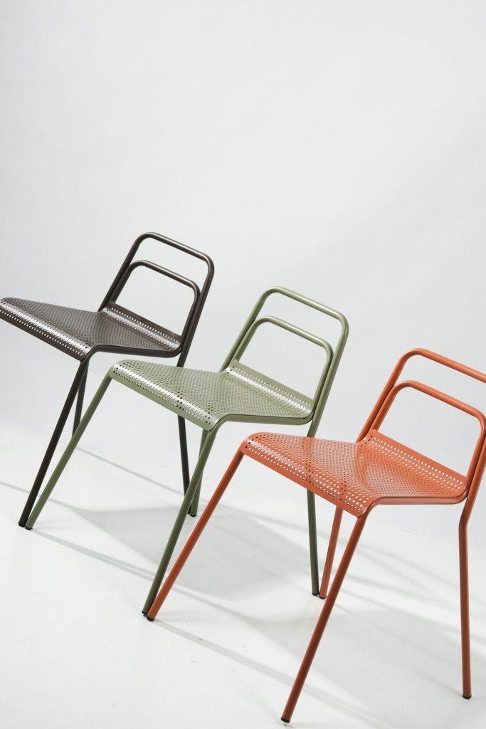 Settecento椅延续Gio Ponti 699 Superleggera的轻盈逻辑,并以钢材重新构建结构表达。两根连续弯曲的金属管一体形成椅腿与靠背,将支撑简化为清晰的线性框架;座面采用CNC激光切割穿孔钢板,在减重的同时实现通风与排水,适配室内外场景。靠背以双横杆替代单横杆,提高受力分布与操控稳定性。表面提供咖啡色、陶土色、开心果绿与透明金属涂层等粉末喷涂方案。整体在工业制造与手工细节之间建立平衡,强调结构的直接性与使用的稳定感。