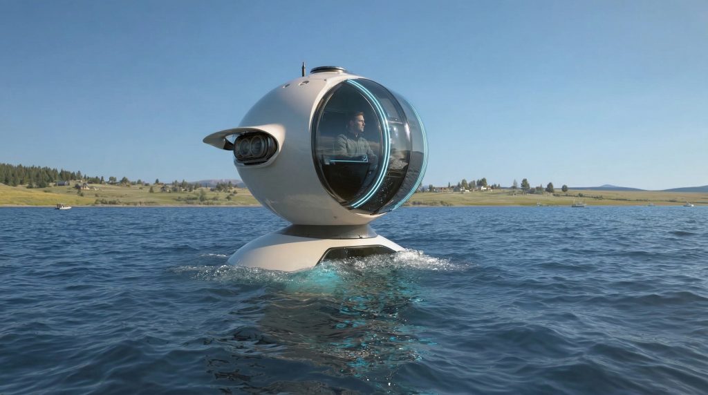 https://s.mj.run/95P8lFTs6hc a futuristic, round underwater drone with large glass windows and led lights on its exterior floating above the water surface of an active lake. the camera is mounted at ground level on top of a tall pole that sticks out from under the waves. in front of it lies a vast expanse of land in shades of green grasses. a clear blue sky overhead contrasts against the dark body color of the sleek vehicle. it creates a striking visual contrast between the metallic texture of space robot with bright white interior and black metal exterior. --ar 128:85 --v 7.0 - Image #4 @MicMJ