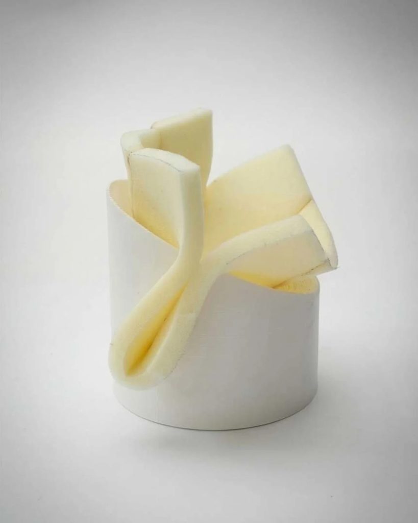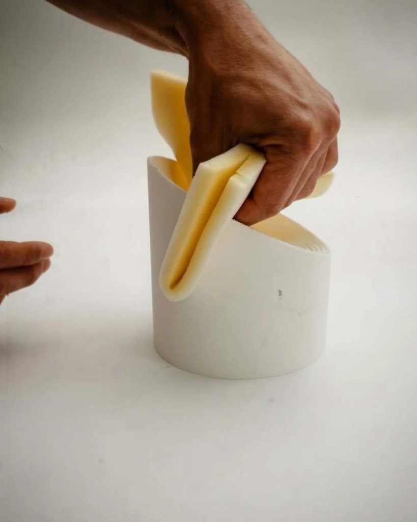Raw-Edges设计了一款实验性椅子,摒弃了胶水、钉子和订书钉等传统紧固件。木质框架上开有凹槽,软垫泡沫直接楔入其中,依靠摩擦力固定,实现严丝合缝的契合。该设计简化了结构,便于拆解和维修,提升了材料的可回收性。目前正与意大利家具公司Bolzan合作开发,有望投入量产