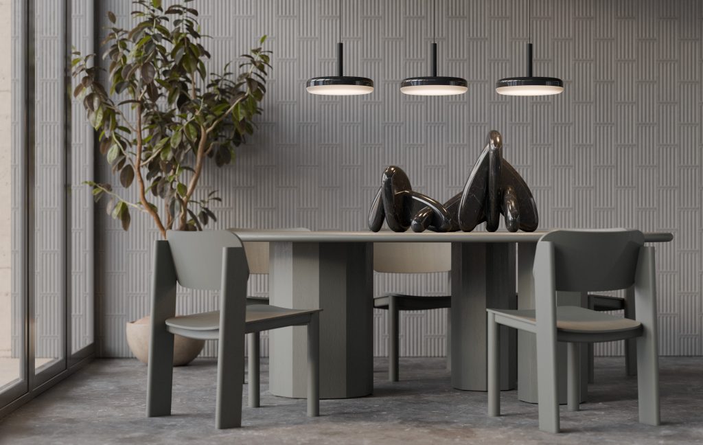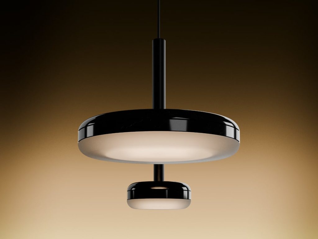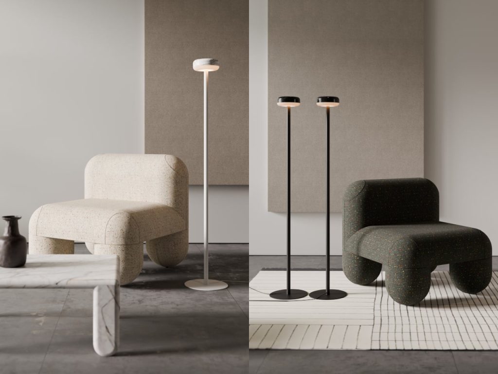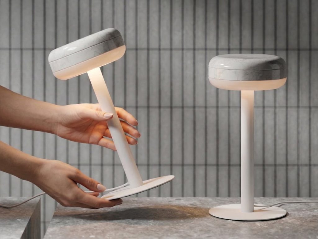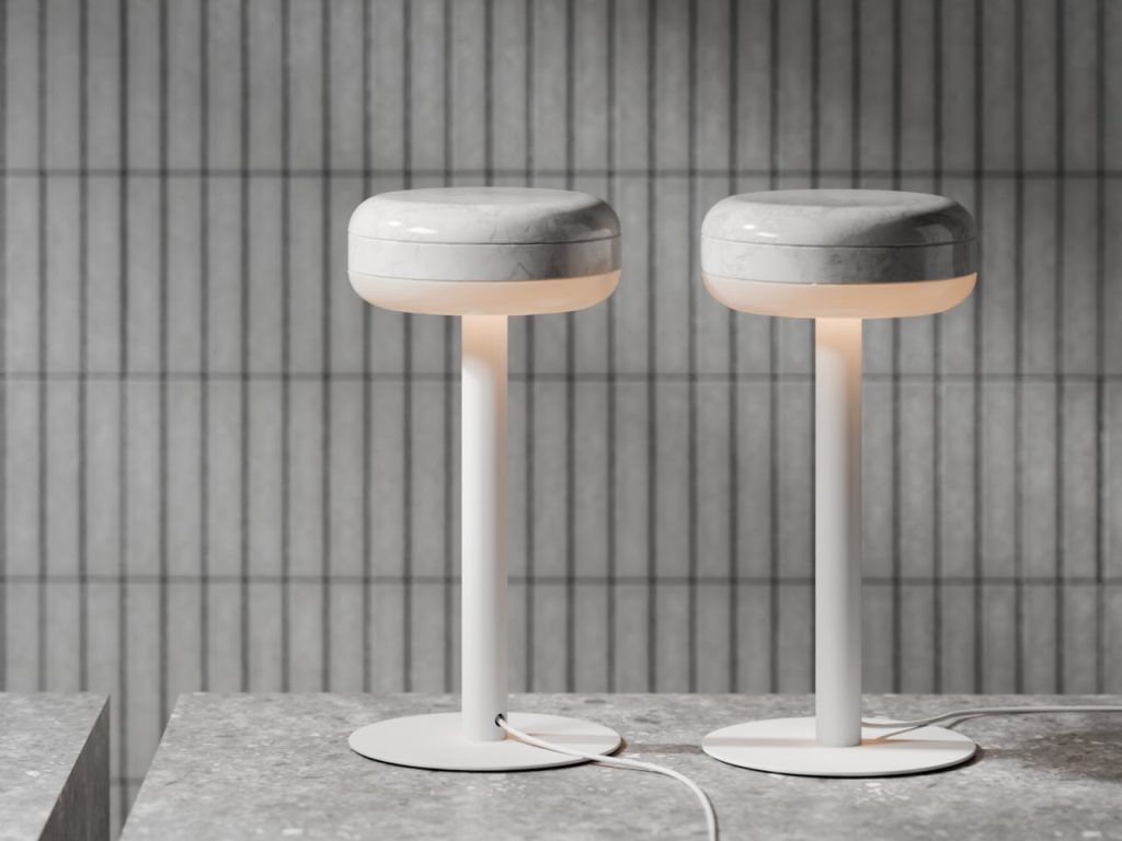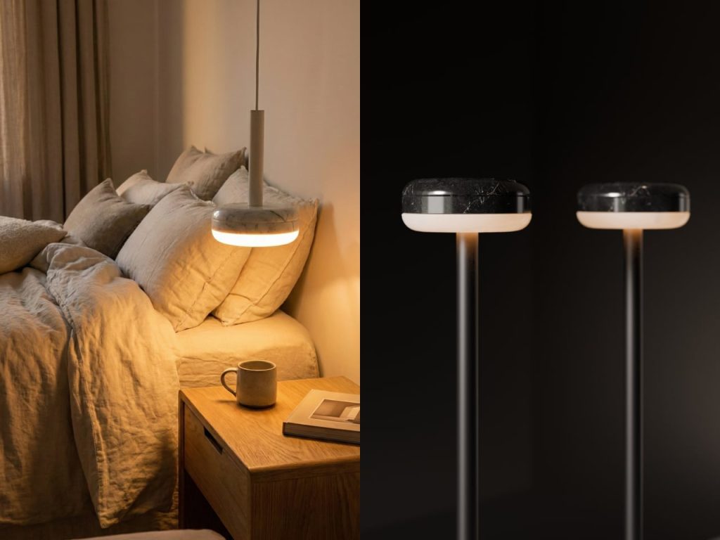 Denys Sokolov 为 deday 设计的 DIP 灯具系列,灵感很直接:一块大理石圆盘,底部被光浸透,暖光从半透明扩散器里慢慢透出来。大理石本身的纹理在白天是装饰,灯亮起来就有了层次。材质的分量感和光晕的柔软感叠在一起,安静但不单调。台灯、落地灯、吊灯、壁灯,同一个核心语言,适应不同空间。不需要复杂结构,一块石头、一团光,就够了。