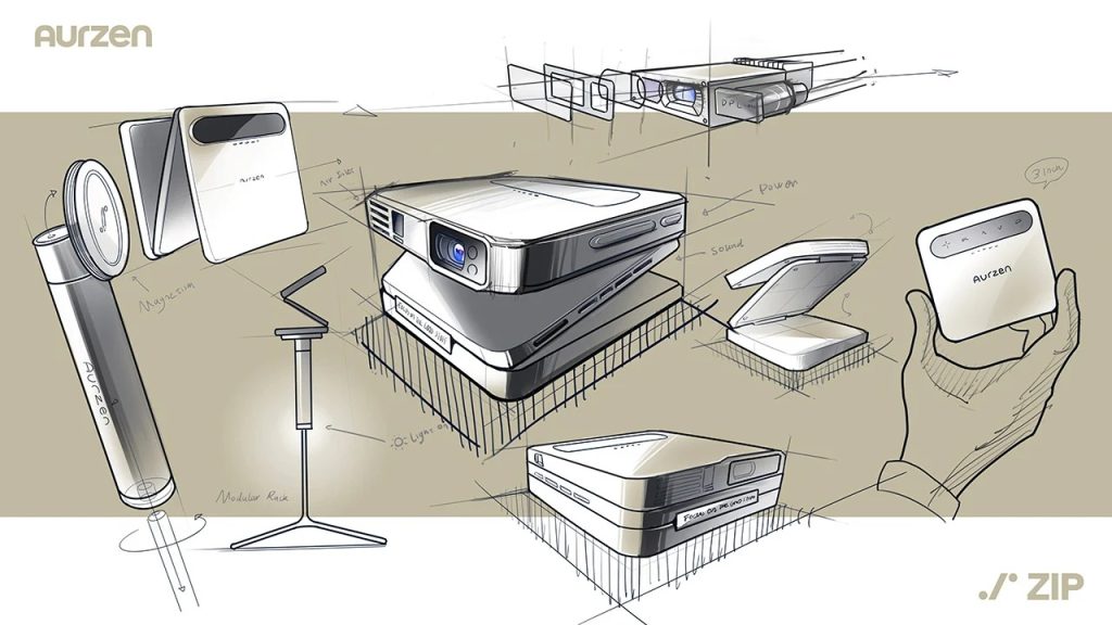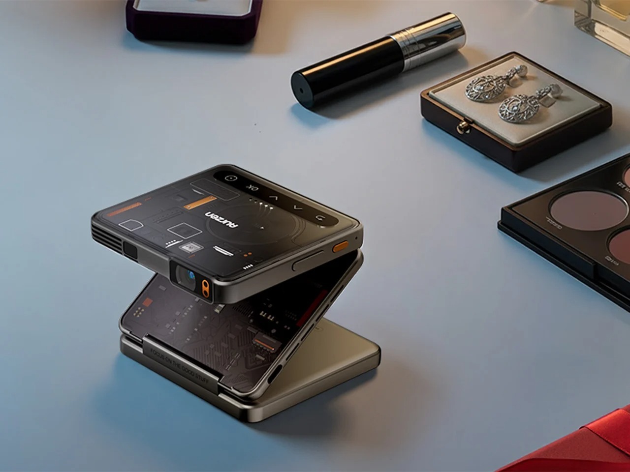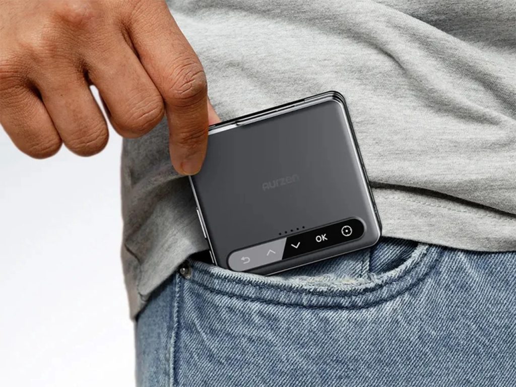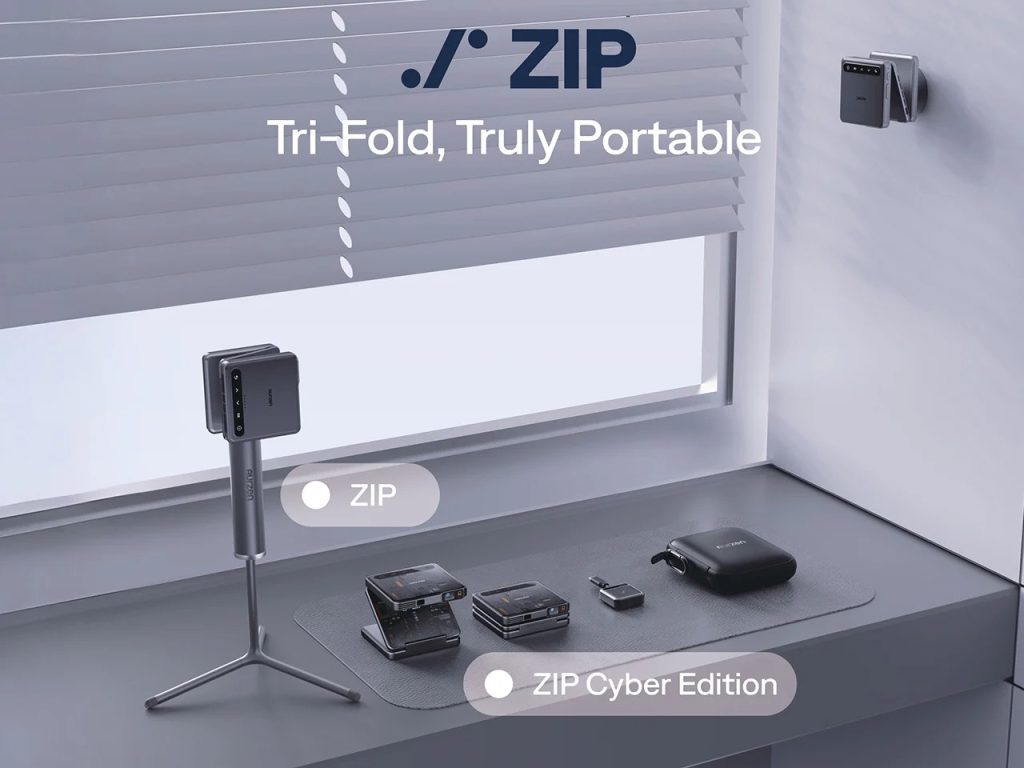 Aurzen ZIP Cyber Edition 是一款三折式便携投影仪,折叠后仅口袋大小,表面带有电路板纹理与橙色装饰。内置5000mAh电池,续航约90分钟,亮度100 ANSI流明,原生720p分辨率,支持ToF自动对焦与蓝牙5.4投屏。可选配磁吸支架、移动电源支架等模块化配件。限量发售并带有独立编号,售价399.99美元,使用优惠码可享40%折扣。