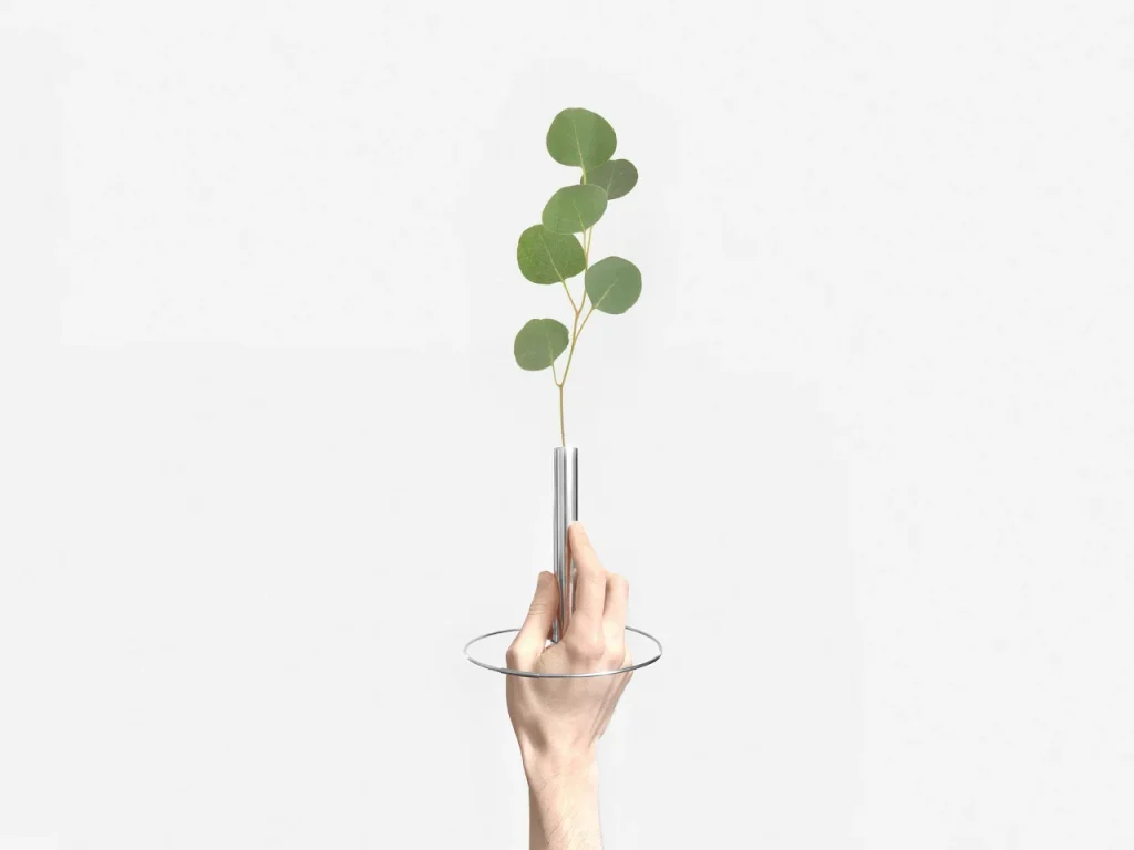 Lotus Effect Vase 不是传统花瓶,而是一场关于“放手”的设计。不锈钢圆环与细柱组合,灵感来自睡莲浮水的姿态——不把花束锁在中央,而是让枝茎自然倾斜、延展,甚至跨过桌面边缘,像叶子掠过水面。设计师 Fabrício Auler 用冷峻金属托住短暂的生命,却给予植物自由:它可以靠在书架边、悬于窗台角,或斜倚在茶几上,姿态随性,不拘一格。花瓶本身成为构图的一部分,而非隐形容器。