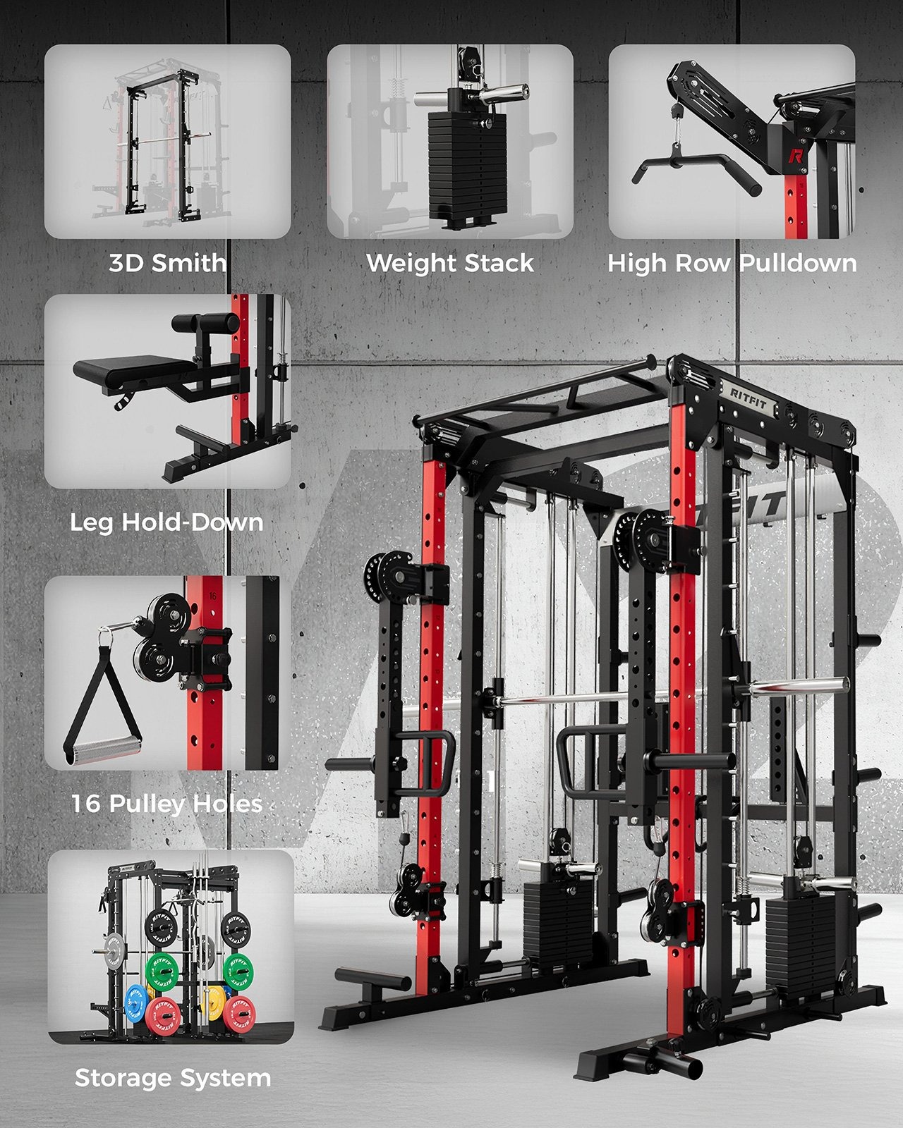 RITFIT M2史密斯机,整合史密斯机、力量架、绳索训练器与储物,占地仅23平方英尺(约2㎡),垂直堆叠省空间。四种配置从简易到全配重,适配不同训练需求,不用改计划迁就器材。解决家庭健身“想练的放不下”痛点,小空间也能搭完整训练方案。