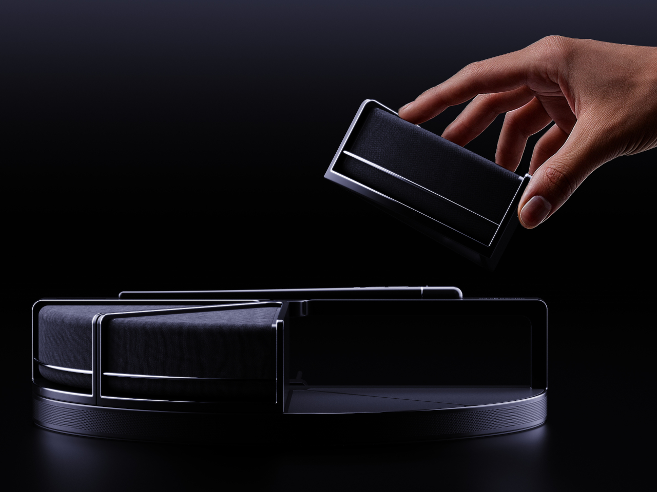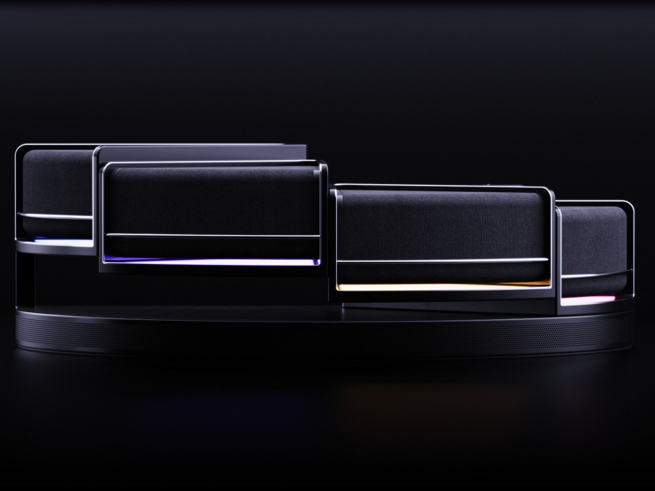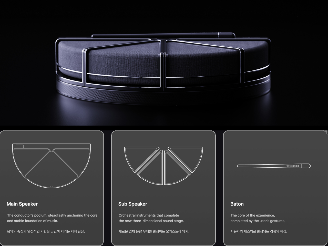 Sound Maestro是一款将“聆听”转化为主动参与的音箱系统,其设计灵感源自交响乐指挥。系统由指挥台式主音箱、四个可拆卸的模块化扬声器以及一根指挥棒组成。与传统立体声或隐藏式智能音箱不同,Sound Maestro通过人工智能将音乐实时拆分为人声、鼓、贝斯与旋律四个声部,并分别输出到对应的独立扬声器中,每个单元以不同颜色的LED灯进行视觉标识,使声音在空间中具象化、可感知。指挥棒是核心交互媒介:在“大师模式”下,用户可通过挥动、指向和旋转等手势完成选曲、音量调节与播放控制;在遥控模式下,则回归更克制的按键操作,允许对单个声部进行精细调节。主音箱负责低频与运算处理,并通过内置屏幕直观呈现系统状态。Sound Maestro不试图融入背景,而是将家庭音响转化为一种带有表演感与空间意识的声音装置。
