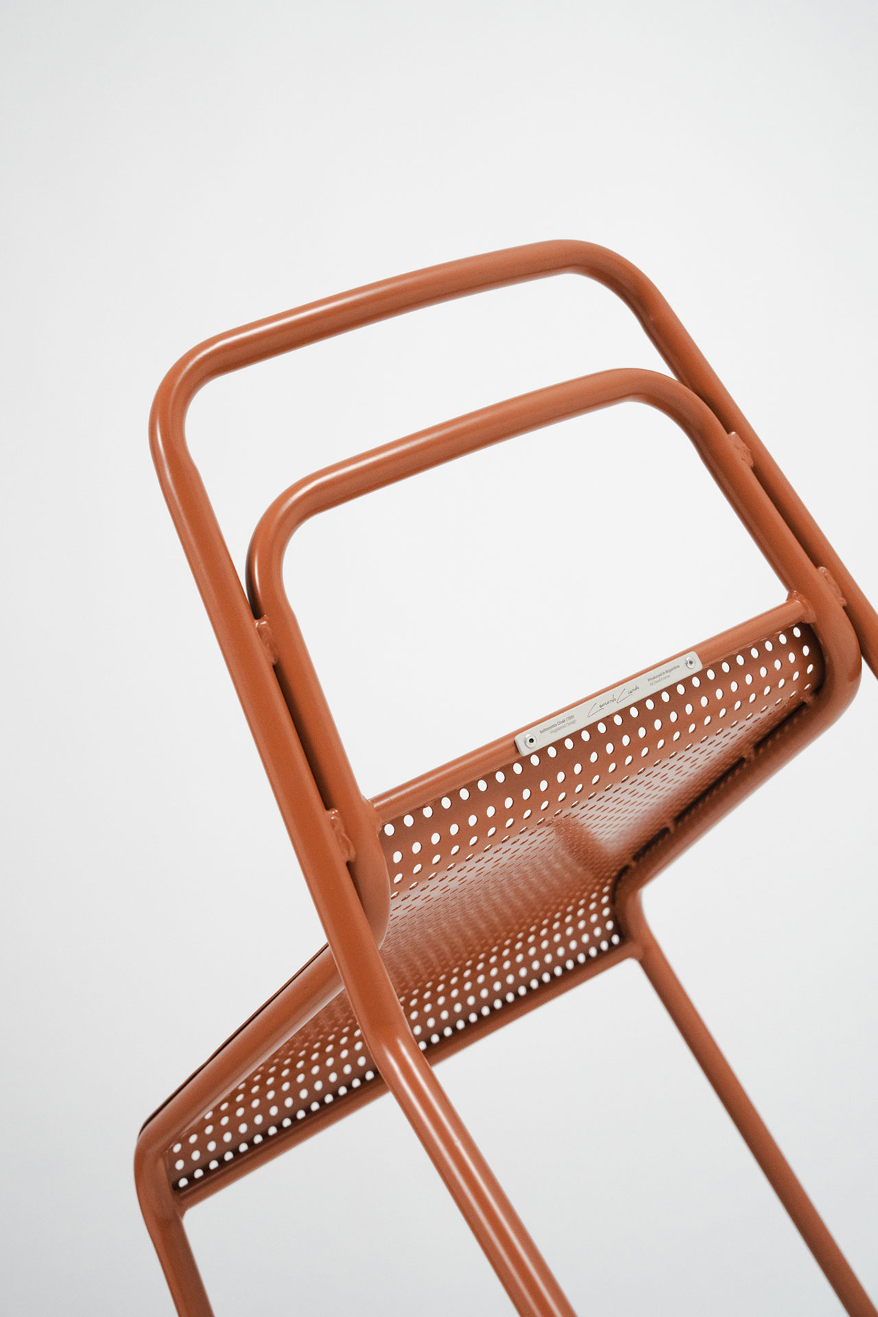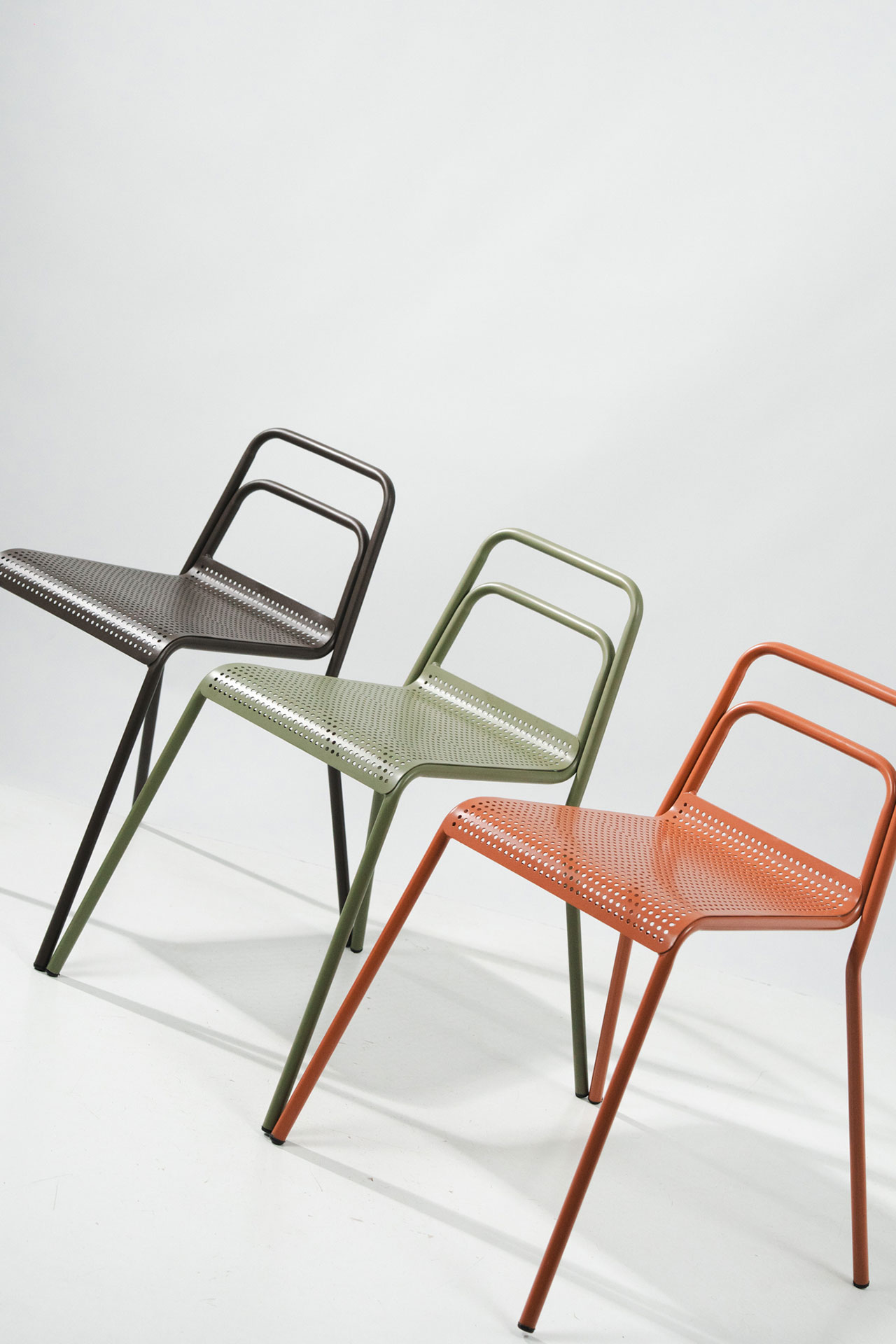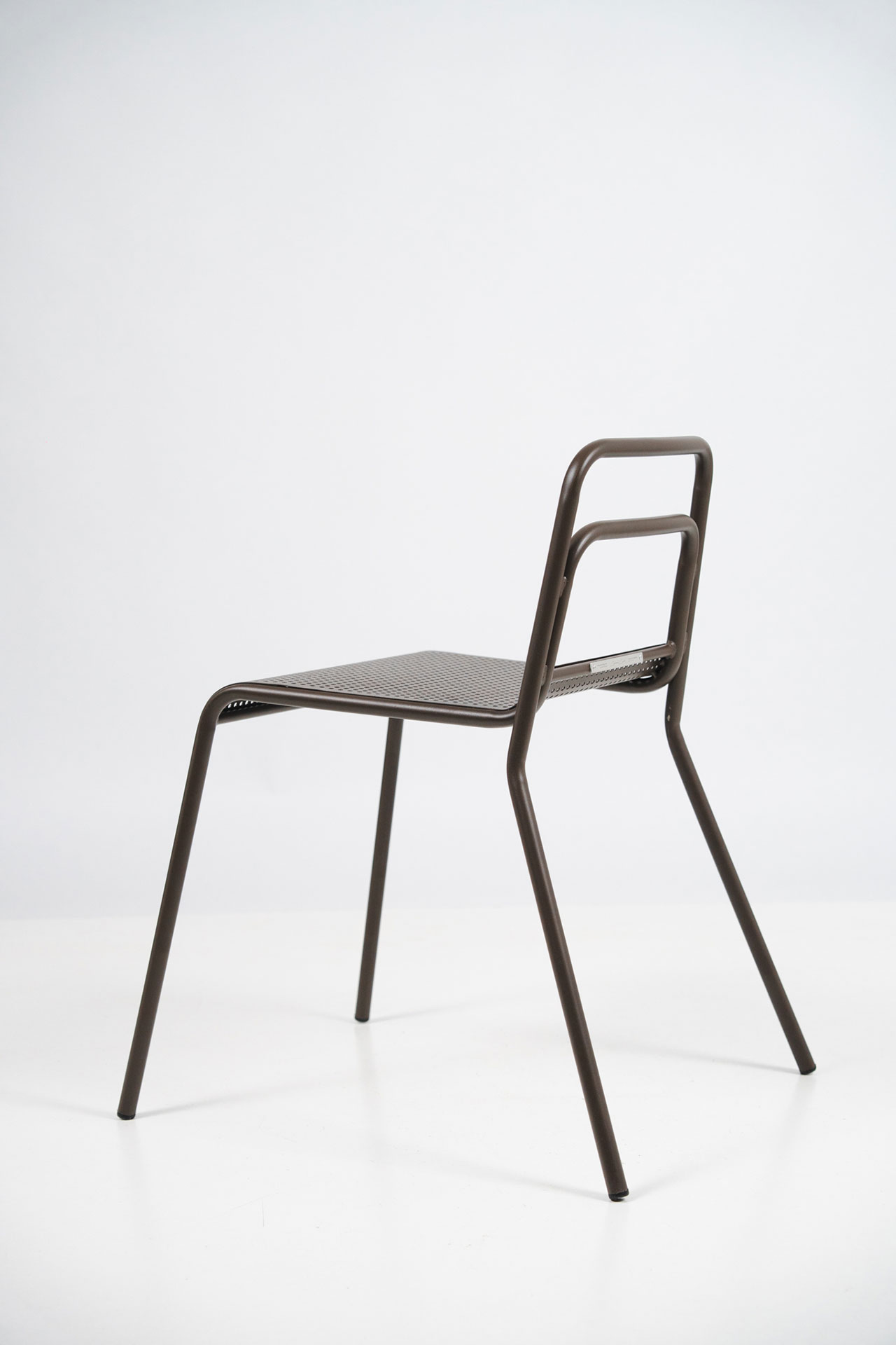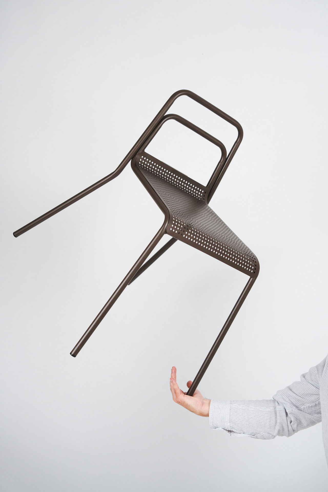 Settecento椅延续Gio Ponti 699 Superleggera的轻盈逻辑,并以钢材重新构建结构表达。两根连续弯曲的金属管一体形成椅腿与靠背,将支撑简化为清晰的线性框架;座面采用CNC激光切割穿孔钢板,在减重的同时实现通风与排水,适配室内外场景。靠背以双横杆替代单横杆,提高受力分布与操控稳定性。表面提供咖啡色、陶土色、开心果绿与透明金属涂层等粉末喷涂方案。整体在工业制造与手工细节之间建立平衡,强调结构的直接性与使用的稳定感。